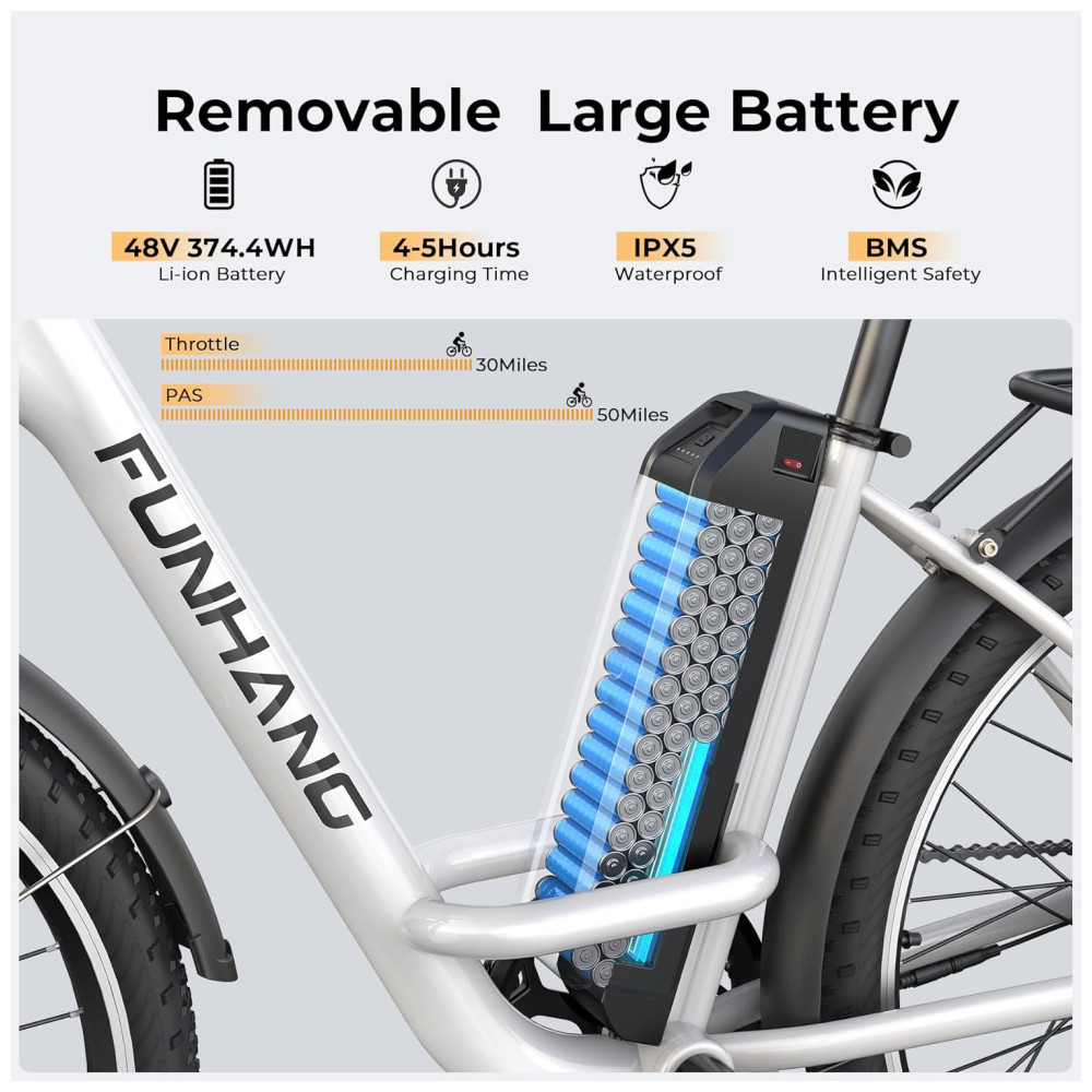 MOTOR BRUSHLESS DE PICO DE 1000 W: A bicicleta elétrica Funhang EB-C1 para adultos adota um motor brushless de alta velocidade de 500 W (PICO DE 1000 W), proporcionando uma velocidade máxima de 35 km/h e um torque máximo de 55 N.m. Seja em subidas ou em terrenos planos, esta bicicleta elétrica urbana lida com tudo sem esforço, com ampla potência e desempenho impressionante. É divertido pedalar pelo bairro, cidade, trilhas de parques, ruas da cidade, campus, praias e áreas de camping.