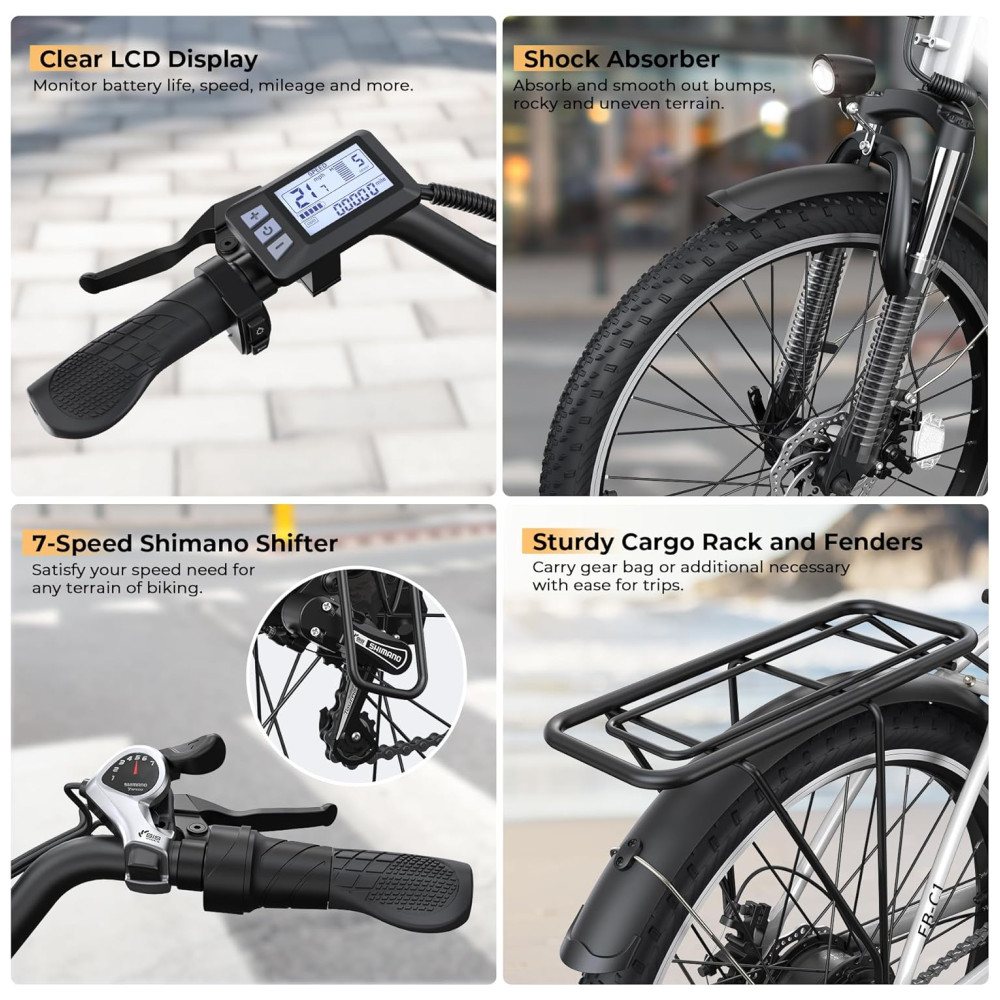 CONFIGURAÇÃO DE SEGURANÇA CONFIÁVEL: O visor LCD inteligente da e-bike exibe claramente a bateria, a velocidade, o nível de PAS, a distância e outros dados de pedalada. O sistema profissional de troca de marchas de 7 velocidades atenderá a todas as suas necessidades de velocidade em subidas, descidas, aceleração, desaceleração e velocidade constante. O garfo dianteiro com suspensão e os freios a disco duplos de 160 mm proporcionam uma pedalada suave e confortável, mesmo em terrenos acidentados. Outros elementos confiáveis, como farol de LED, buzinas elétricas e refletores, mantêm você seguro durante a pedalada.