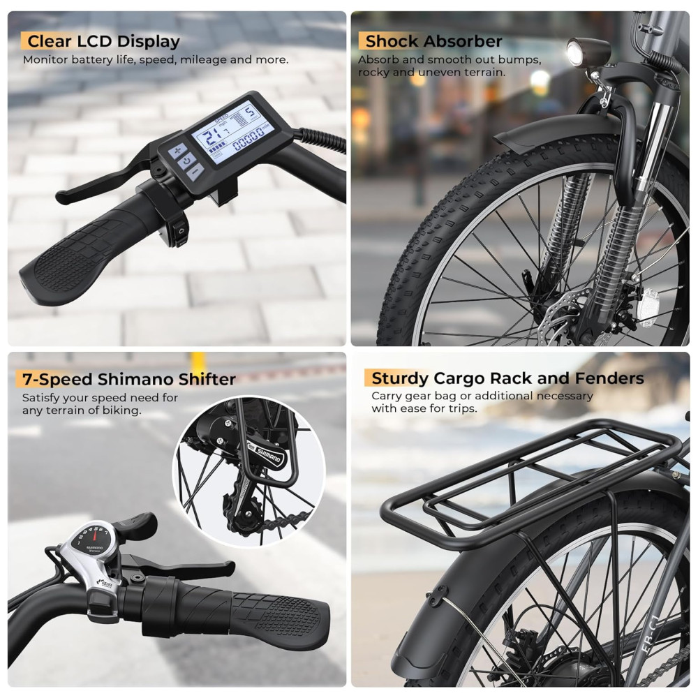 CONFIGURAÇÃO DE SEGURANÇA CONFIÁVEL: O visor LCD inteligente da e-bike exibe claramente a bateria, a velocidade, o nível de PAS, a distância e outros dados de pedalada. O sistema profissional de troca de marchas de 7 velocidades atenderá a todas as suas necessidades de velocidade em subidas, descidas, aceleração, desaceleração e velocidade constante. O garfo dianteiro com suspensão e os freios a disco duplos de 160 mm proporcionam uma pedalada suave e confortável, mesmo em terrenos acidentados. Outros elementos confiáveis, como farol de LED, buzinas elétricas e refletores, mantêm você seguro durante a pedalada.