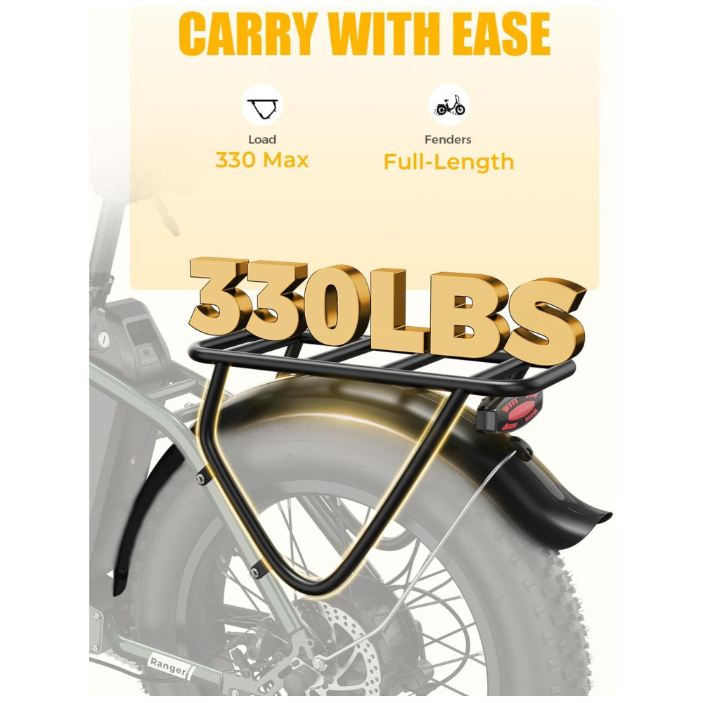 Design Otimizado para Conforto – O assento amplo da bicicleta elétrica dobrável Ranger aumenta o conforto, proporcionando uma experiência de pilotagem semelhante à de uma nuvem. O bagageiro traseiro e os para-lamas robustos suportam bagagem de até 150 kg.