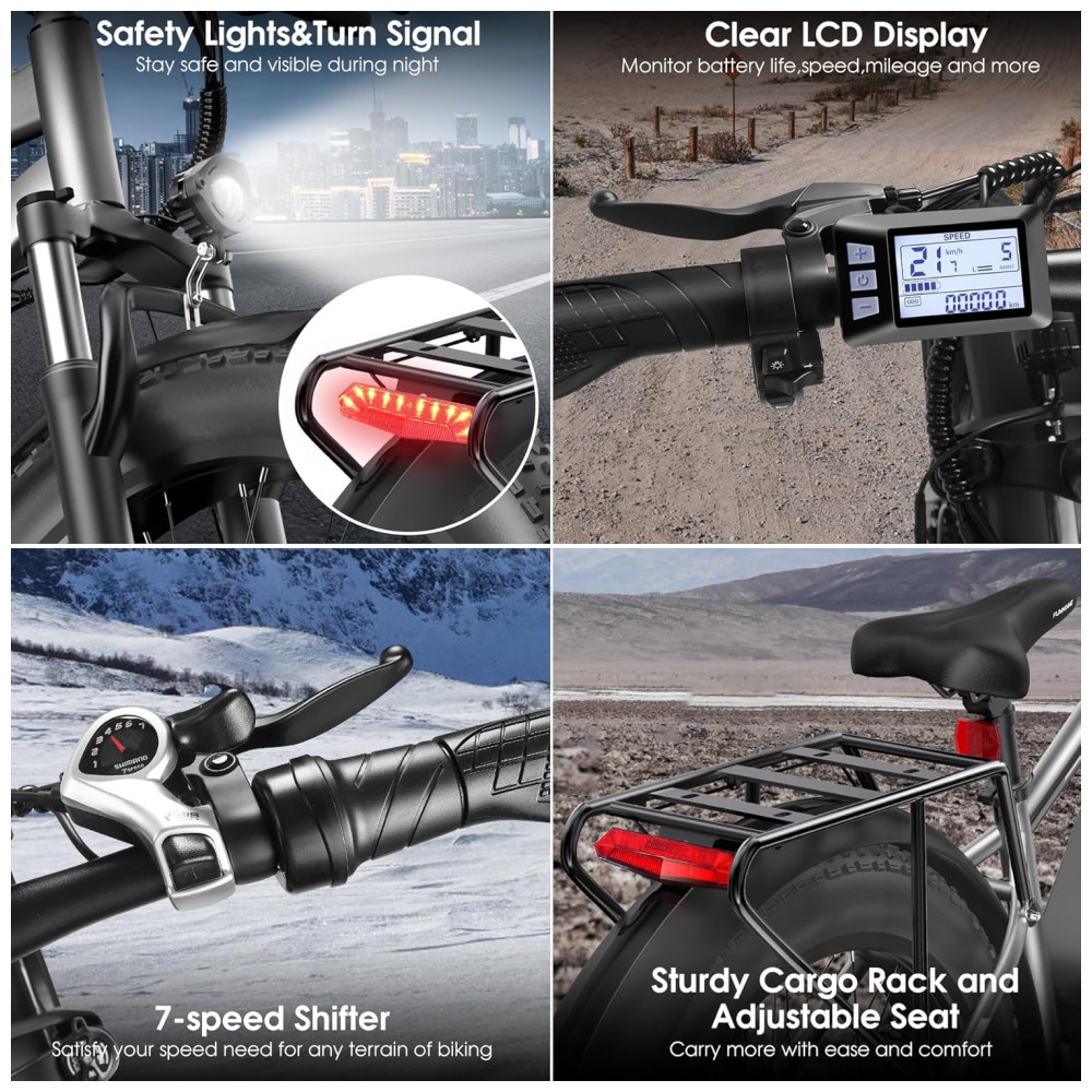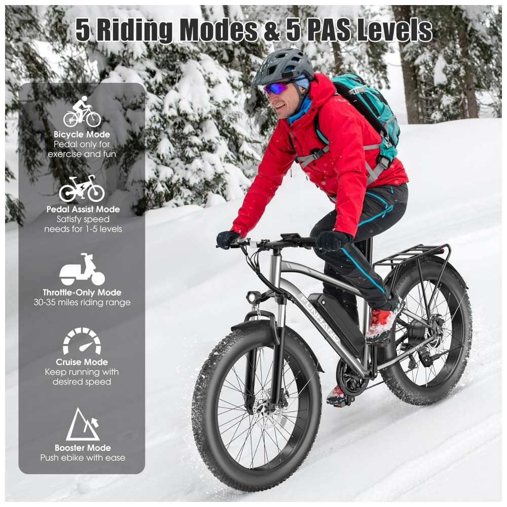 A bicicleta elétrica Fat Tire Funhang EBS1 de 1000W Peak Brushless Motor é perfeita para adultos que buscam aventuras emocionantes. Com um motor brushless de 500W (pico de 1000W), atinge até 25MPH, facilitando subidas e off-road. Equipada com uma bateria de íon de lítio de 48V 13AH com capacidade de 55-60 milhas em modo pedal assistido e 28-30 milhas no modo elétrico. O sistema de segurança confiável inclui suspensão dianteira, freios a disco, farol e luz traseira, além de sinalizador de curvas. Resistente, a bicicleta possui quadro de alta resistência, pneus largos resistentes a perfurações e bagageiro traseiro. Com 5 modos de pilotagem e 7 marchas, é perfeita para passeios urbanos, trilhas e praias. Fácil de instalar, com 12 meses de garantia.