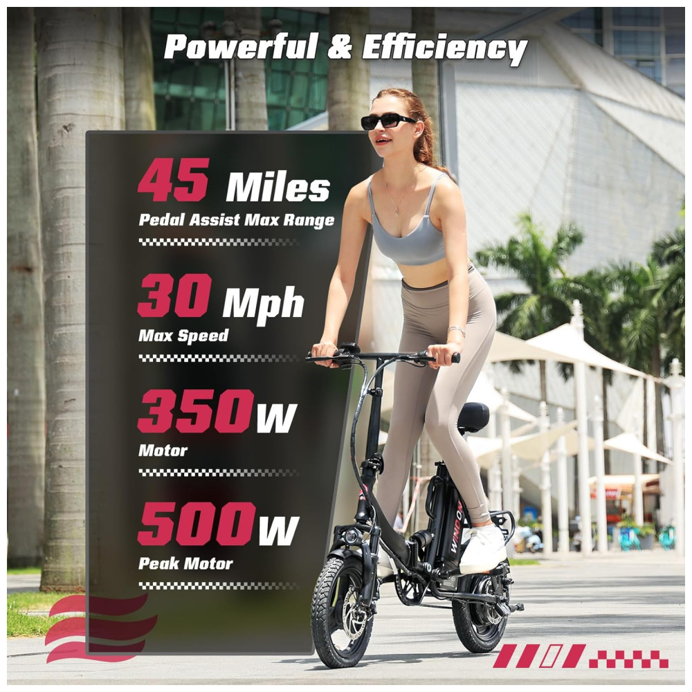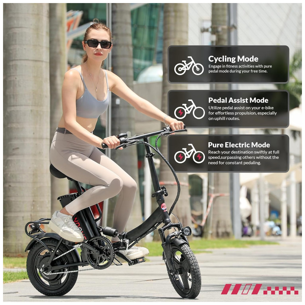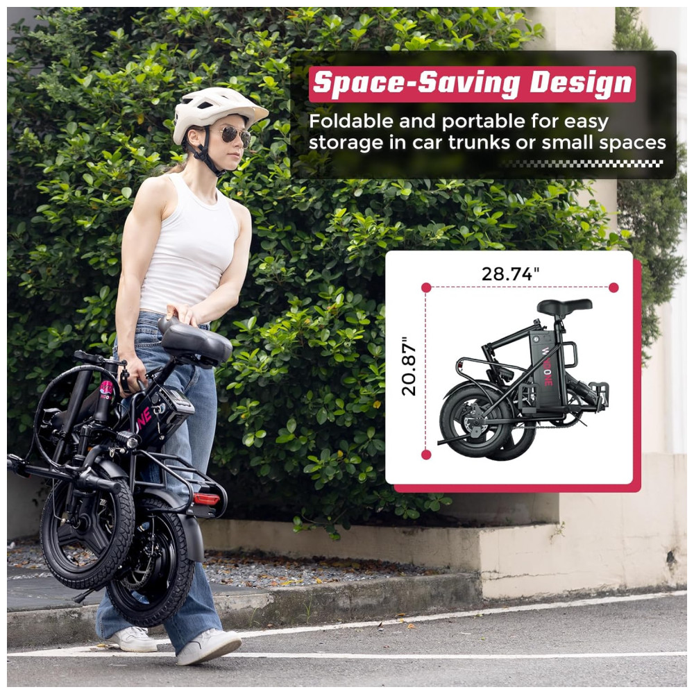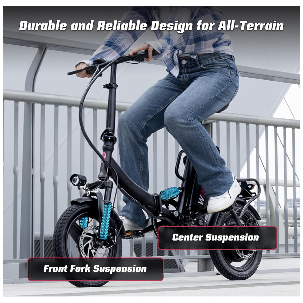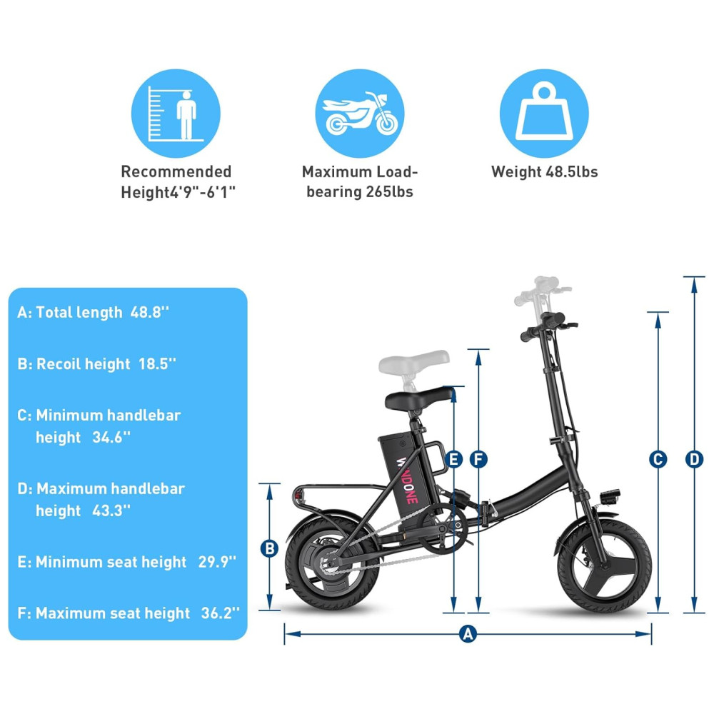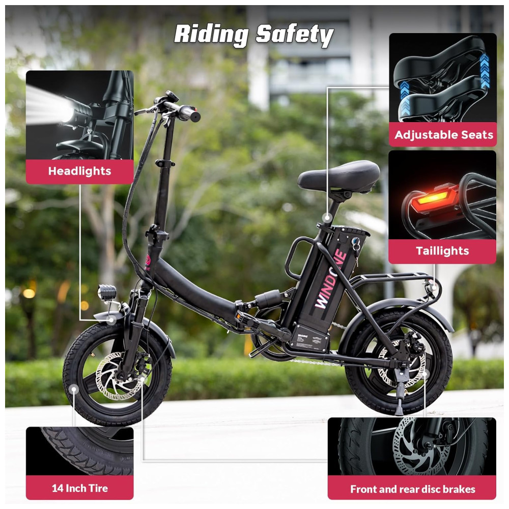 Eficiência sem Esforço: Com um potente motor de 350W (pico de 500W), a bicicleta elétrica Windone S14 oferece até 45 km de autonomia com pedal assistido, tornando cada passeio uma experiência suave e agradável. Aprovada pela certificação UL 2849 e o laboratório de testes é UL LLC. Velocidade com Segurança: Cruze confortavelmente a até 30 km/h, garantindo sua segurança com freios a disco dianteiro e traseiro, proporcionando uma potência de frenagem confiável quando você mais precisa. A velocidade máxima e a autonomia máxima só podem ser alcançadas sob condições específicas. A vida útil da bateria variará dependendo do peso do ciclista, condições da estrada e velocidade. Conforto Resistente: Experimente um passeio mais suave com o garfo dianteiro integrado e os amortecedores centrais, garantindo que cada solavanco seja absorvido, proporcionando o máximo conforto em qualquer terreno. Design Adaptável: Com pneus de 14 polegadas e assentos ajustáveis, a bicicleta elétrica dobrável é projetada para oferecer conforto e adaptabilidade ideais, atendendo a uma ampla gama de ciclistas e preferências. Desempenho Duradouro: Equipada com uma bateria removível de 36V 7.8Ah, desfrute de passeios prolongados sem se preocupar com a falta de energia, e com um tempo de carregamento de 5-6 horas, você estará de volta à estrada rapidamente. Quando a luz do carregador mudar de verde para vermelho, significa que a bateria está totalmente carregada. Certifique-se de que esteja totalmente carregada antes de andar. Montagem Fácil: A ebike foi altamente montada para facilitar a montagem. Se tiver alguma dúvida, entre em contato com nossa equipe de suporte pós-venda. Faremos o melhor para ajudá-lo a resolver seu problema e responderemos dentro de 24 horas.
