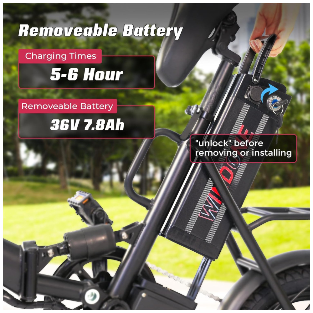 Bicicleta Elétrica Dobrável Windone S14 Preto Fosco – Motor 350W (Pico 500W) Velocidade Máxima 30km/h Autonomia 45km Rodas 14″ Suspensão Traseira Bateria Removível 36V 78Ah