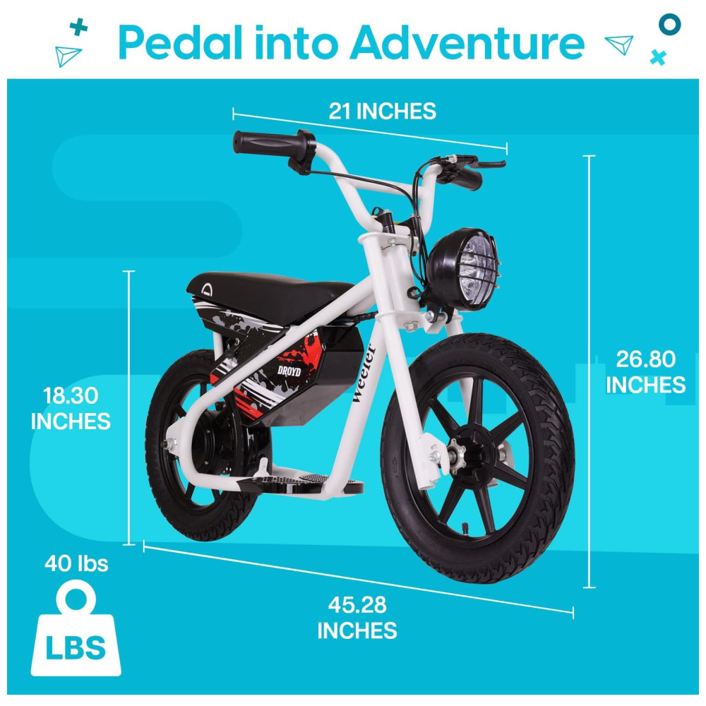 Segurança e diversão andam de mãos dadas além de ter um acelerador de partida lenta, sua certificação ASTM F963 significa que nossa minibicicleta elétrica Weeler é segura para crianças. Você pode se sentir à vontade sabendo que seu filho pode andar de bicicleta elétrica para crianças onde quiser.