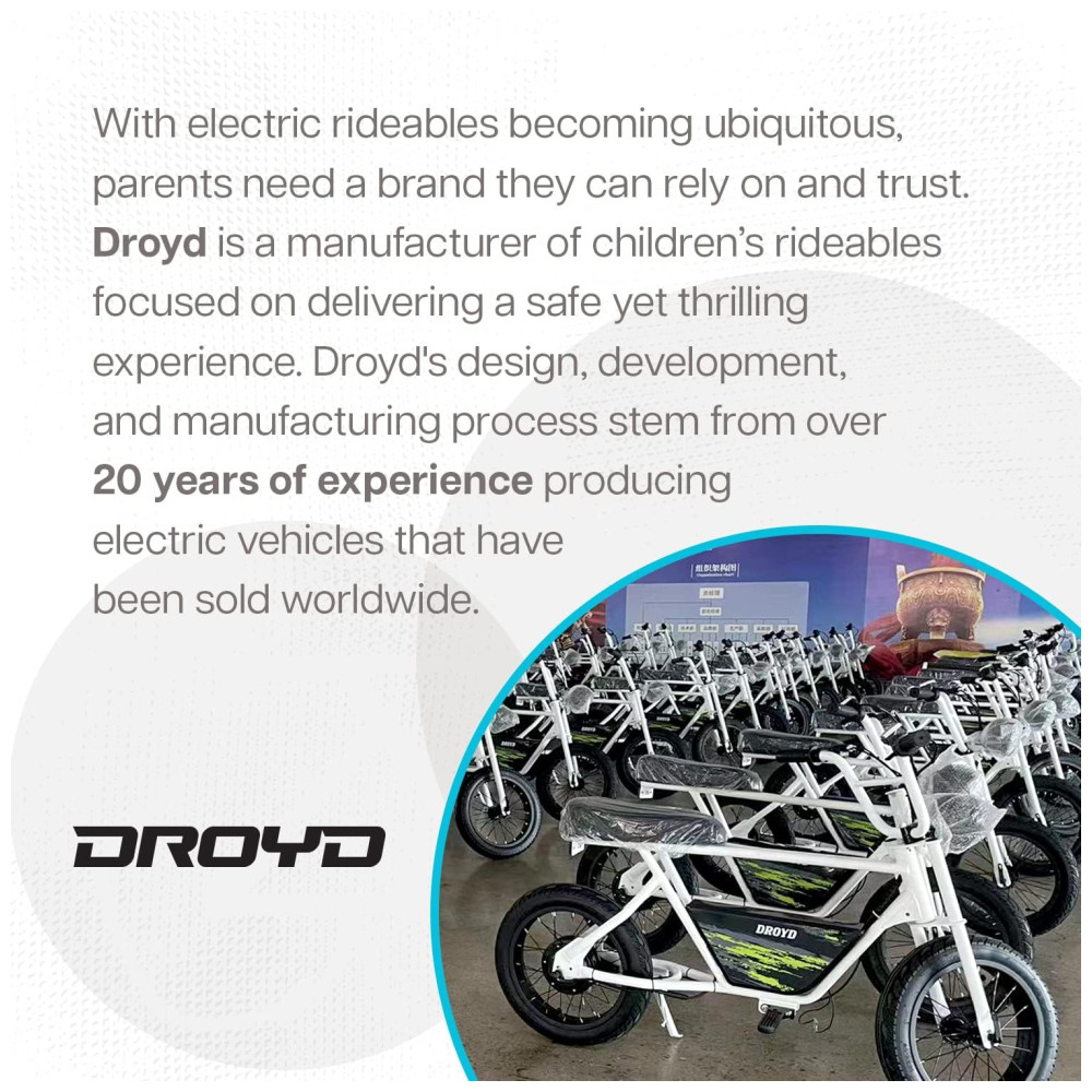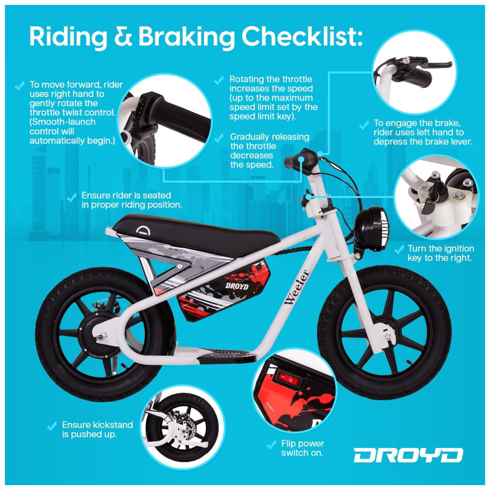 Weeler and Go Nossa bicicleta motorizada elétrica é conveniente para os pais, pois vem principalmente pré montada, precisando apenas instalar o suporte e o guidão. Os pais podem se registrar para obter garantias diretamente no site da Droyd