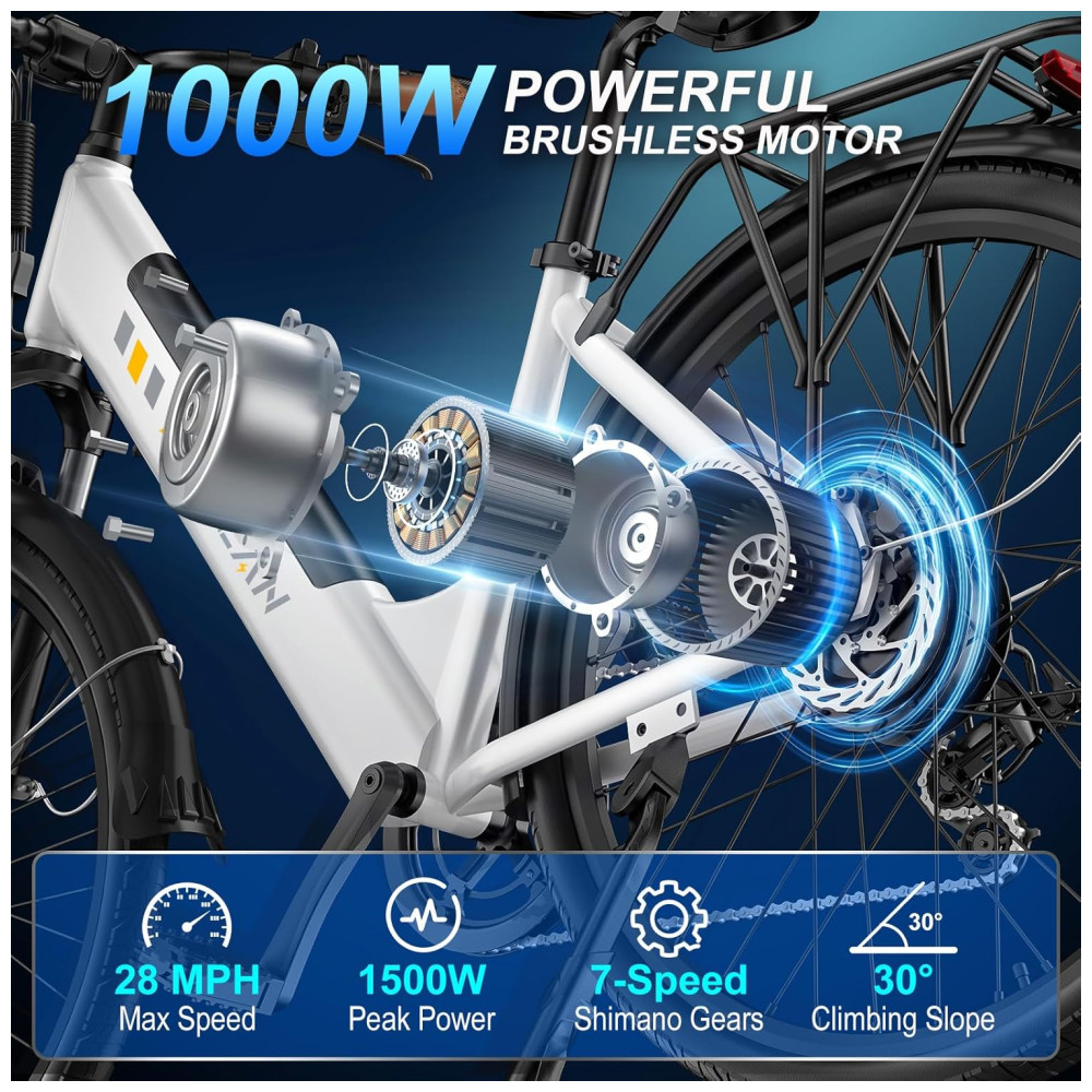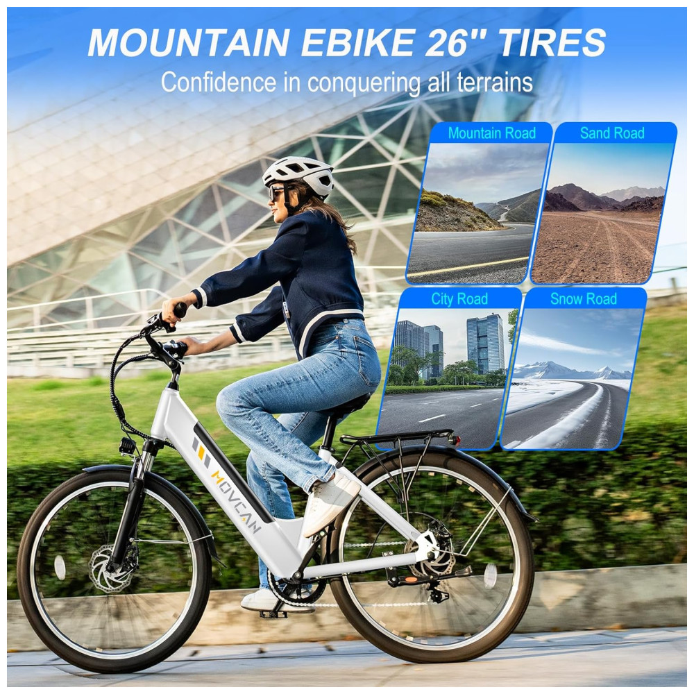 【Motor potente de 1000 W】A bicicleta elétrica Movcan V80 possui um motor de cubo sem escovas de 1000 W (pico de 1500 W) integrado, permitindo que a bicicleta elétrica para adultos atinja uma velocidade máxima de 45 km/h. O motor robusto oferece um torque de 80 N.M, superando facilmente colinas íngremes de 30°. Você pode desfrutar de uma experiência de pilotagem confortável e frenagem potente, mesmo em declives acentuados, terrenos acidentados ou outros terrenos extremos.