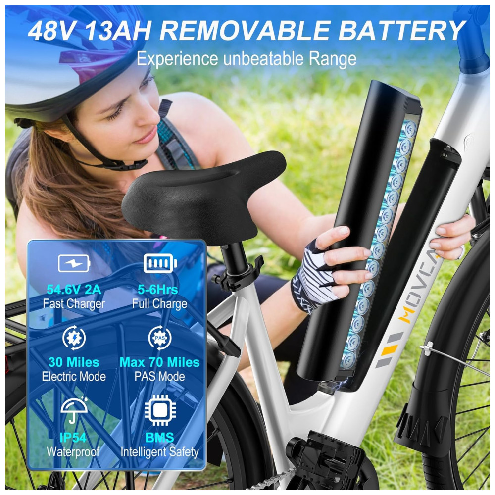 【Bateria removível de 48 V 13 Ah e exploração ilimitada】A bicicleta elétrica é equipada com baterias de 48 V 13 Ah, certificadas pela UL2849 e com sistema BMS, o que aumenta significativamente a segurança. O design removível torna mais conveniente carregar a bateria em casa ou no escritório. Oferecendo até 112 km de autonomia por carga (modo PAS) e 48 km no modo puramente elétrico. Permitindo que você vá a qualquer lugar que desejar.