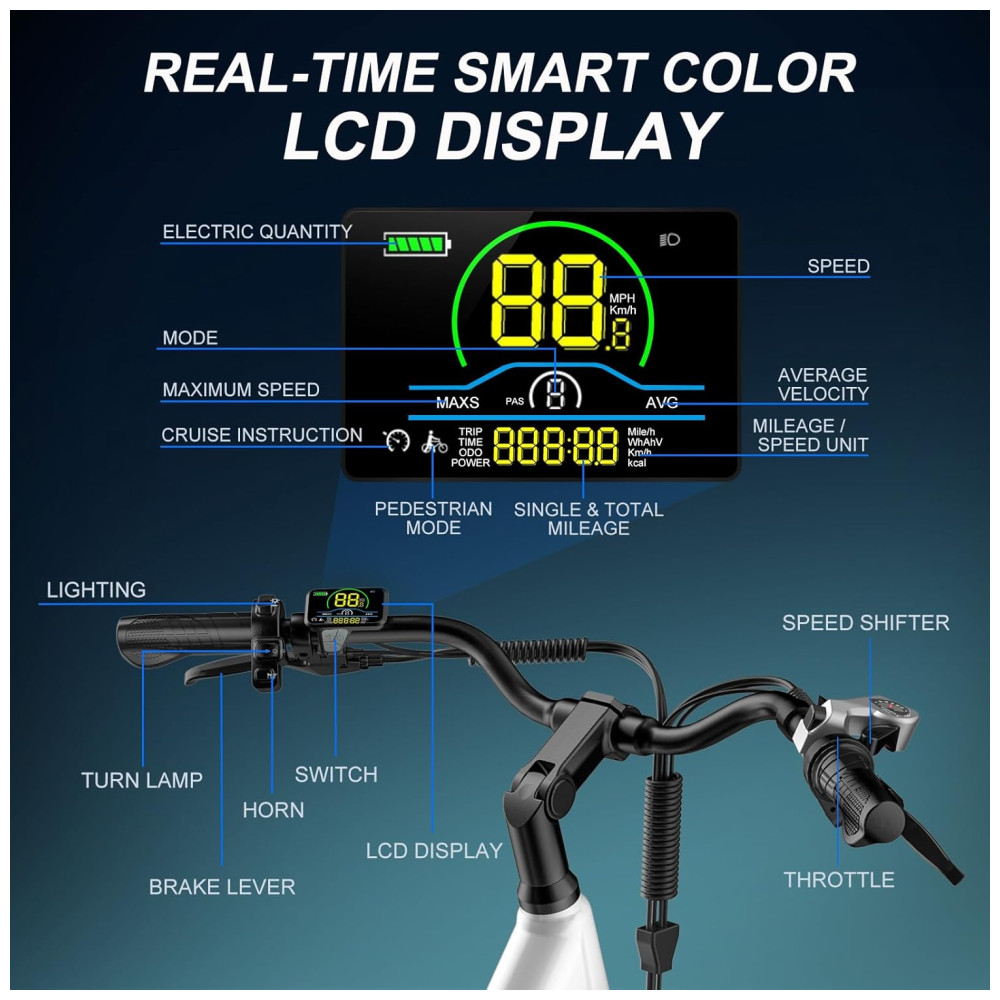 【4 Modos de Condução e 7 Marchas】A e-bike oferece 4 modos de condução: elétrica pura, PAS, cruzeiro e bicicleta. O câmbio profissional de 7 velocidades permite a troca de marchas para se adaptar a diferentes terrenos, com visor LCD multifuncional que monitora facilmente os dados de condução, como velocidade atual, quilometragem por viagem, quilometragem total, nível da bateria, etc. Você também pode ajustar 4 modos de condução para configurações personalizadas que atendem às suas necessidades em diferentes cenários.