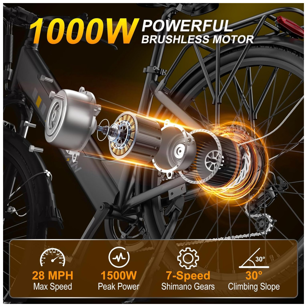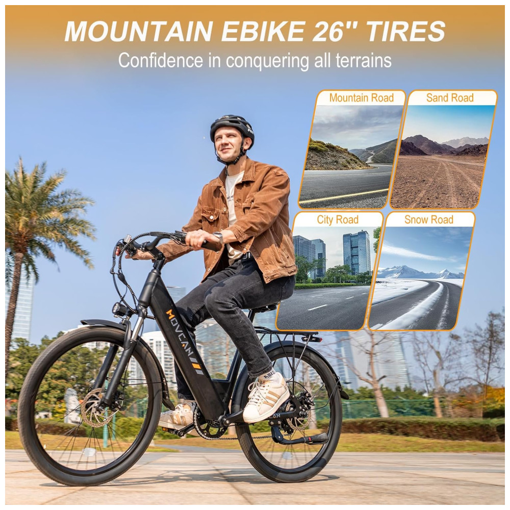 【Motor potente de 1000 W】A bicicleta elétrica Movcan V80 possui um motor de cubo sem escovas de 1000 W (pico de 1500 W) integrado, permitindo que a bicicleta elétrica para adultos atinja uma velocidade máxima de 45 km/h. O motor robusto oferece um torque de 80 N.M, superando facilmente colinas íngremes de 30°. Você pode desfrutar de uma experiência de pilotagem confortável e frenagem potente, mesmo em declives acentuados, terrenos acidentados ou outros terrenos extremos.