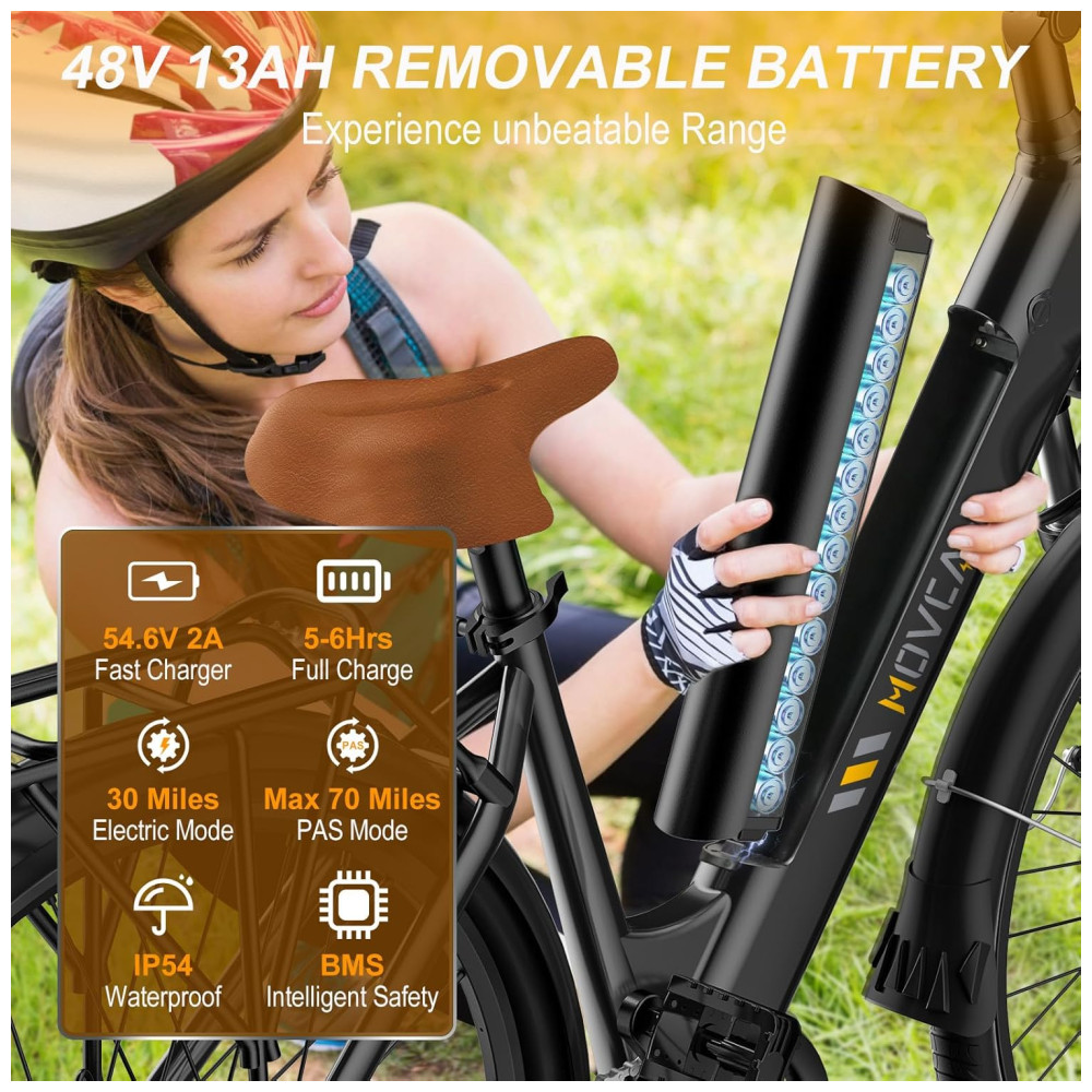 【Bateria removível de 48 V 13 Ah e exploração ilimitada】A bicicleta elétrica é equipada com baterias de 48 V 13 Ah, certificadas pela UL2849 e com sistema BMS, o que aumenta significativamente a segurança. O design removível torna mais conveniente carregar a bateria em casa ou no escritório. Oferecendo até 112 km de autonomia por carga (modo PAS) e 48 km no modo puramente elétrico. Permitindo que você vá a qualquer lugar que desejar.