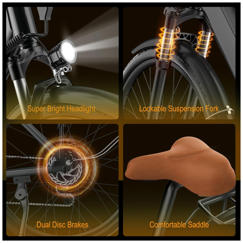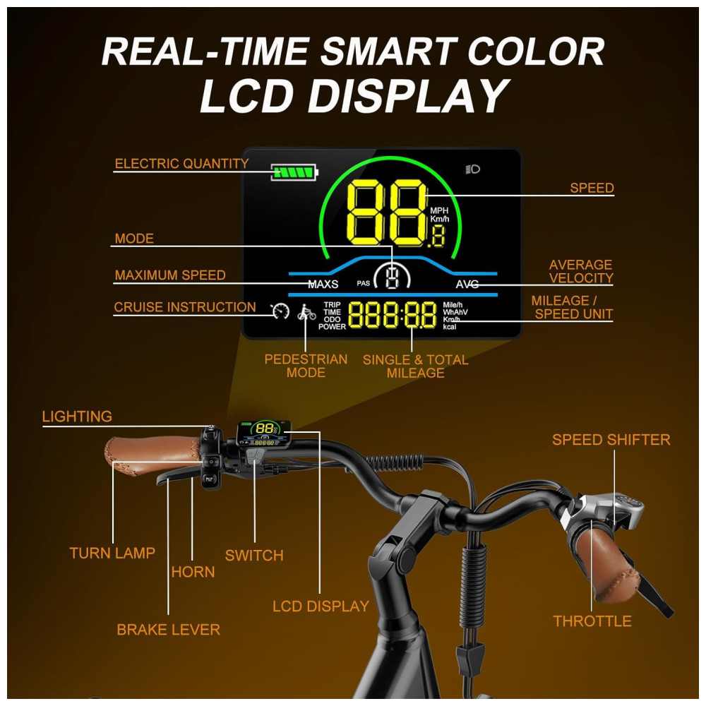 【4 Modos de Condução e 7 Marchas】A e-bike oferece 4 modos de condução: elétrica pura, PAS, cruzeiro e bicicleta. O câmbio profissional de 7 velocidades permite a troca de marchas para se adaptar a diferentes terrenos, com visor LCD multifuncional que monitora facilmente os dados de condução, como velocidade atual, quilometragem por viagem, quilometragem total, nível da bateria, etc. Você também pode ajustar 4 modos de condução para configurações personalizadas que atendem às suas necessidades em diferentes cenários.
