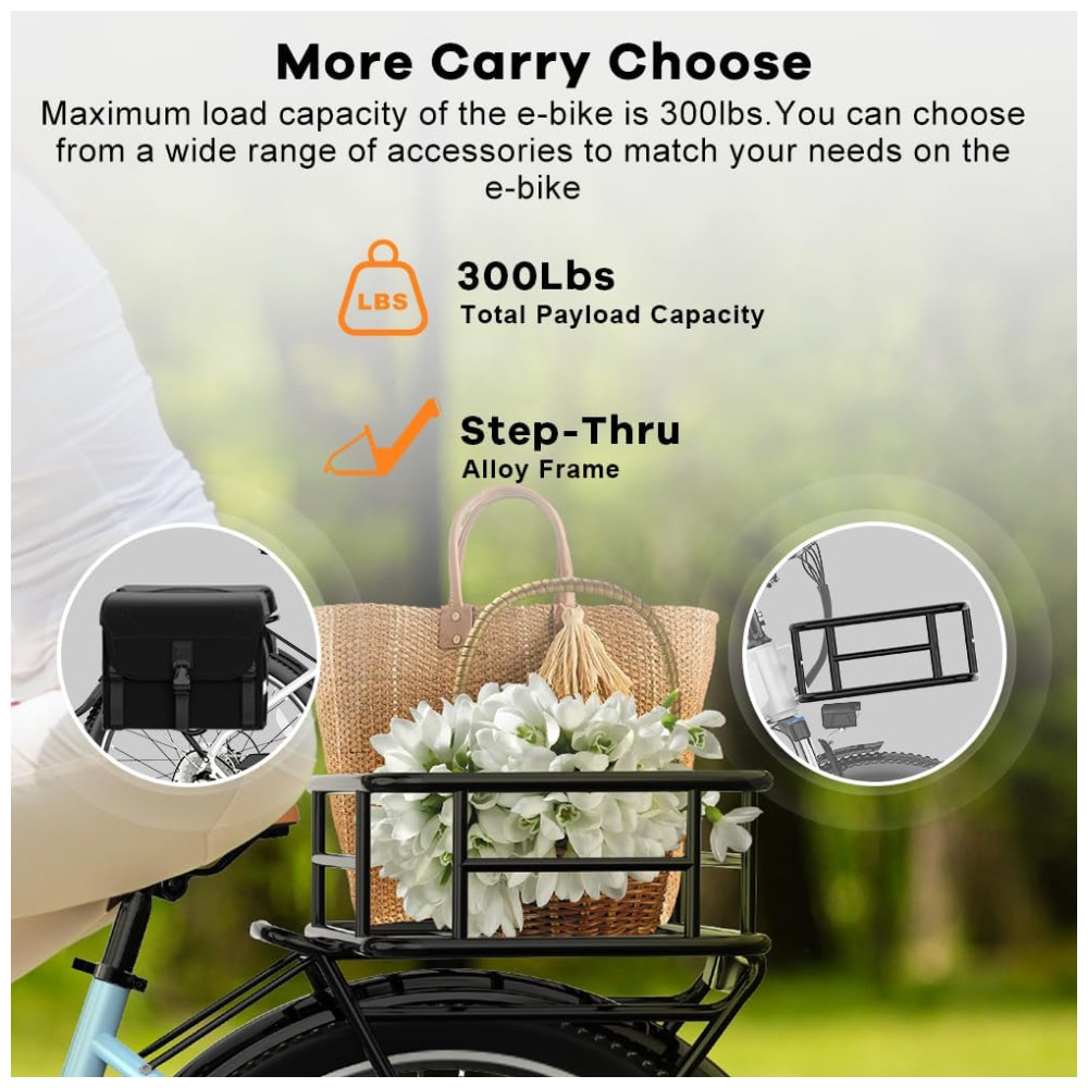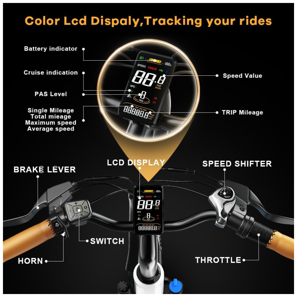 Bicicletas elétricas de alta performance e ciclismo: Com 5 modos de pilotagem (modo elétrico puro, modo de assistência ao pedal, modo de bicicleta clássica) e 5 níveis de assistência ao pedal (PAS) para sua escolha. O visor LCD colorido mostra a velocidade em tempo real, a carga da bateria, os níveis de assistência ao pedal, a quilometragem e muito mais, é fácil para você monitorar seus passeios de dia e de noite. A função de controle de cruzeiro pode ser ligada e desligada facilmente com o toque de um botão.