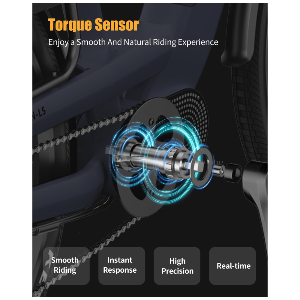A bicicleta elétrica VITILAN L5, com sensor de torque em vez do tradicional sensor de velocidade, garante uma saída de potência suave e estável, sem a sensação de pedalar vazio, mesmo em níveis altos de PAS e com o Shimano de 7 velocidades. Projetada para aqueles que buscam um treino intenso, oferece uma experiência de pedalada suave, confortável e segura. Com o motor traseiro potente de 500W (pico de 960W), atinge até 25MPH. A bateria Samsung de 720Wh proporciona autonomia de até 80km no modo PAS e 50km no modo elétrico. Equipada com freios a disco hidráulicos, a L5 oferece potência, estabilidade e segurança superiores. Com estrutura de alumínio robusta, suporta até 150kg e possui cesta dianteira como brinde. Ideal para compras, deslocamentos locais e viagens curtas. A altura recomendada é de 160-198cm.