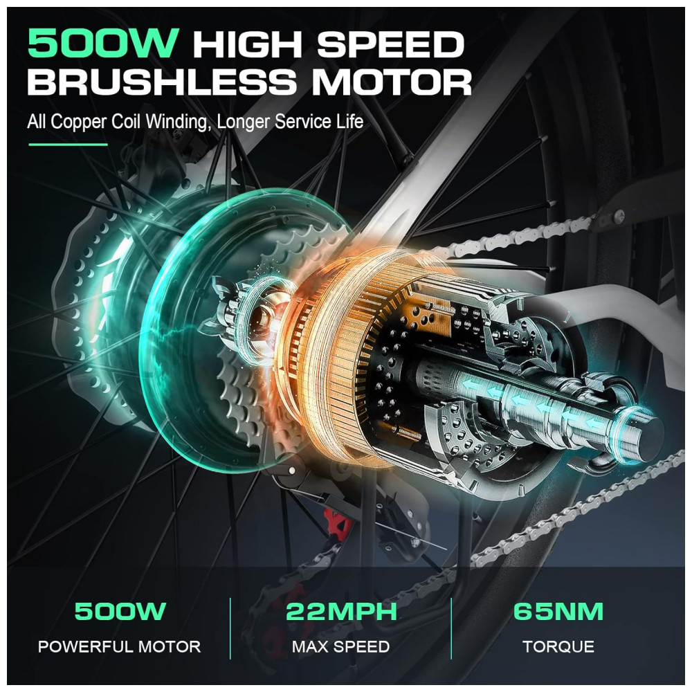 【MOTOR POTENTE DE 48V 500W】A bicicleta elétrica urbana VIVI é equipada com um motor brushless de alta velocidade de 48V 500W, com potência máxima de até 1000W, proporcionando potência suficiente para seus passeios diários e viagens à praia. Com velocidades de até 35 km/h, ela chegará ao seu destino mais rápido, proporcionando potência para subidas e acelerações mais rápidas.