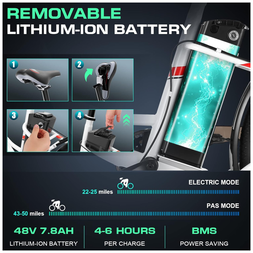 【BATERIA REMOVÍVEL】Equipada com bateria removível, esta bicicleta elétrica é capaz de percorrer de 35 a 40 km no modo totalmente elétrico e de 71 a 80 km no modo de assistência ao pedal (modo PAS). Duas formas de carregamento: carregando na bicicleta ou removendo a bateria para carregar. Você pode levar a bateria para sua casa ou escritório para recarregar, com carga total em 4 a 6 horas. Seu deslocamento diário será mais rápido e econômico.