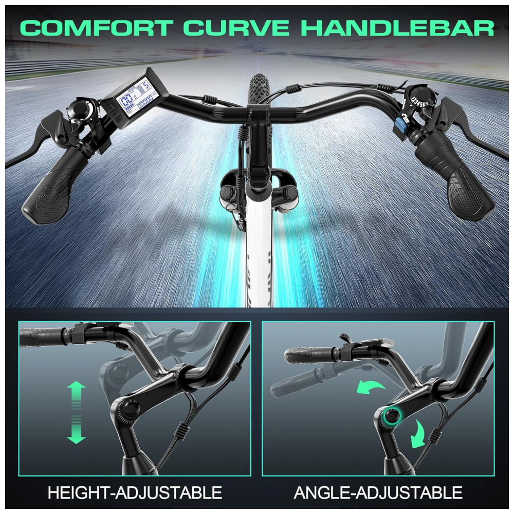【MATERIAL DE QUALIDADE PREMIUM】A bicicleta elétrica de 26″ é feita de um quadro leve e resistente de aço carbono. As rodas dianteiras e traseiras são de liga de alumínio de dupla camada, proporcionando maior durabilidade e um passeio mais rápido com menos arrasto. O quadro baixo desta bicicleta cruiser facilita a subida e descida. O guidão largo e curvado para trás ajuda você a pedalar em uma posição natural e confortável, mesmo em percursos longos. Ideal para passeios casuais e confortáveis.