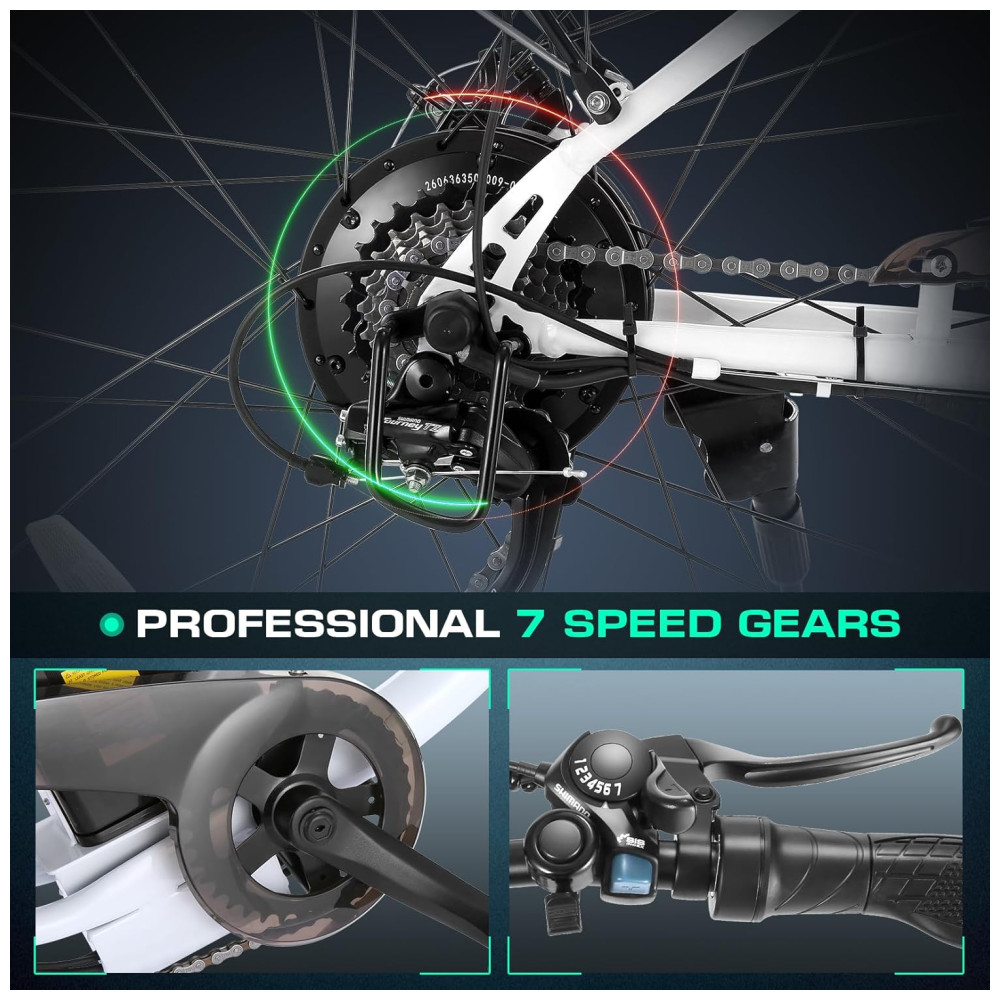 【CONFIGURAÇÃO PREMIUM】Com freios a disco dianteiros e traseiros para uma frenagem confiável em todas as condições climáticas, protegendo totalmente sua segurança. Sistema de transmissão profissional de 7 velocidades, você pode escolher qualquer velocidade de acordo com suas necessidades e desfrutar de uma viagem segura e tranquila. O assento confortável e o guidão largo são ótimos para longos passeios de lazer ou para o trabalho. Equipada com design de linha impermeável removível, acessórios fáceis de substituir.