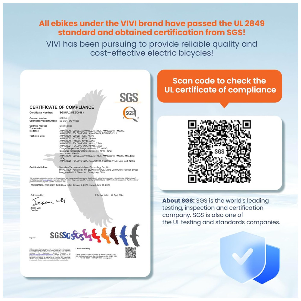 【Certificação de Segurança e Qualidade】Vivi Gopina possui certificação UL2849 (Número do Certificado: SGSNA/24/SZ/00183). Comprar uma e-bike com certificação UL é uma escolha inteligente para segurança e garantia de qualidade.