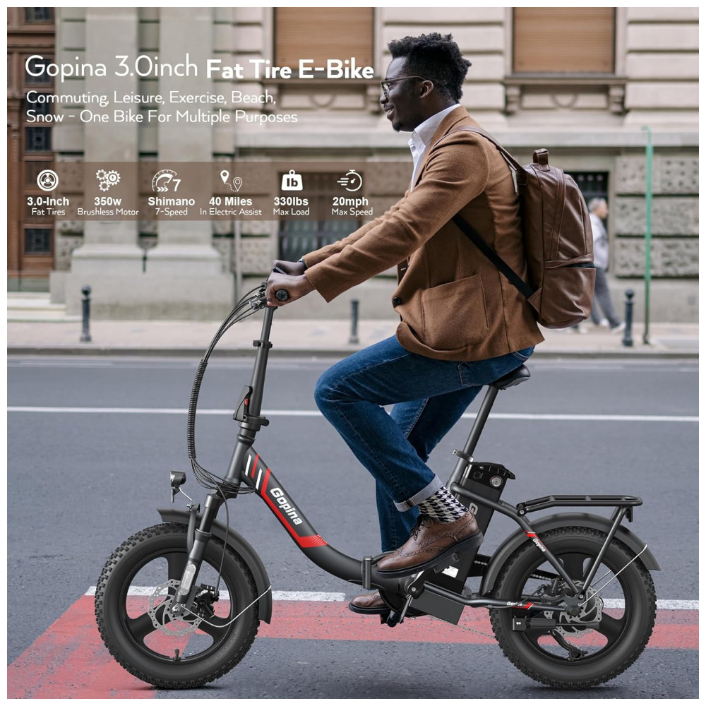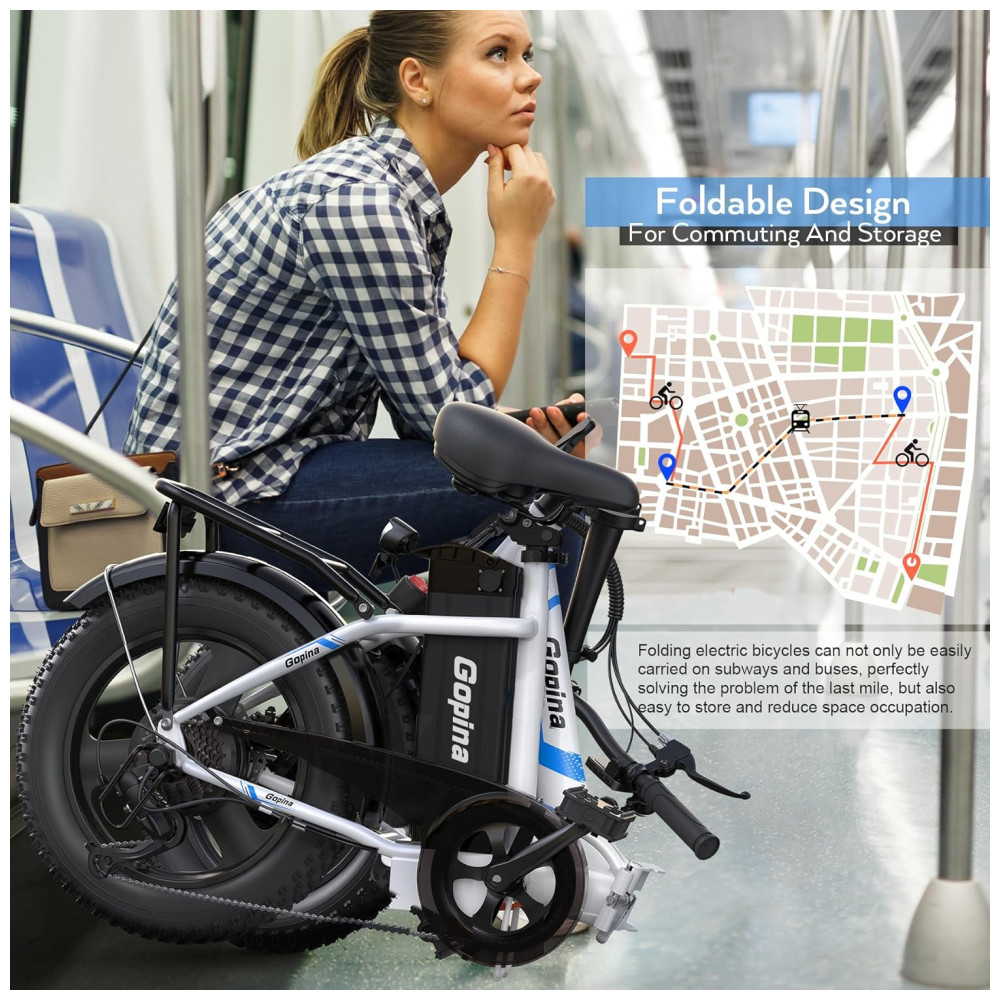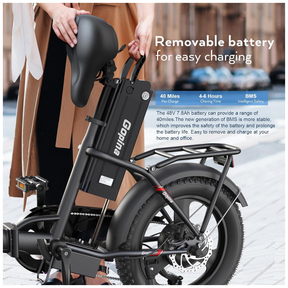 Vivi Gopina UL: e-bike com motor 350W, bateria 48V 7,8Ah, quadro dobrável degrau baixo, pneus fat resistentes a furos e autonomia de até 80 km. Conforto e segurança para todos os terrenos.