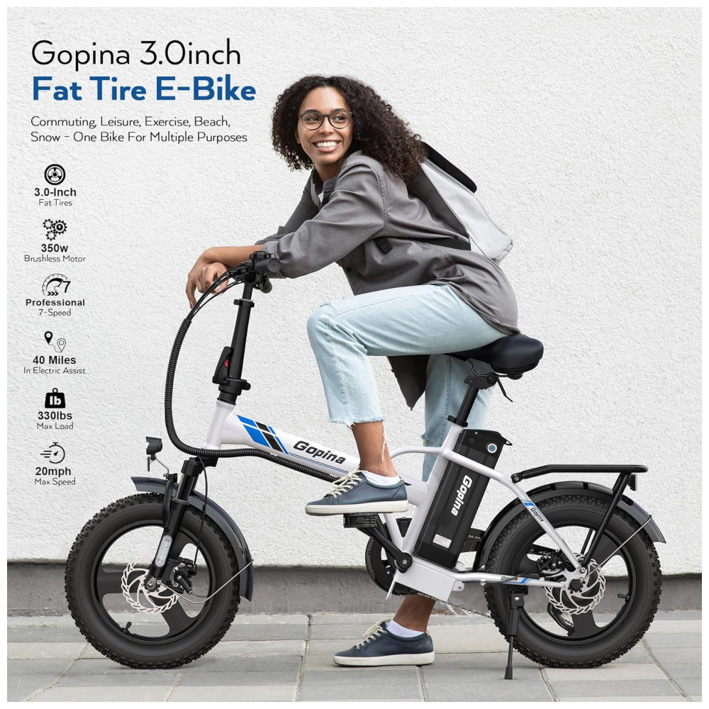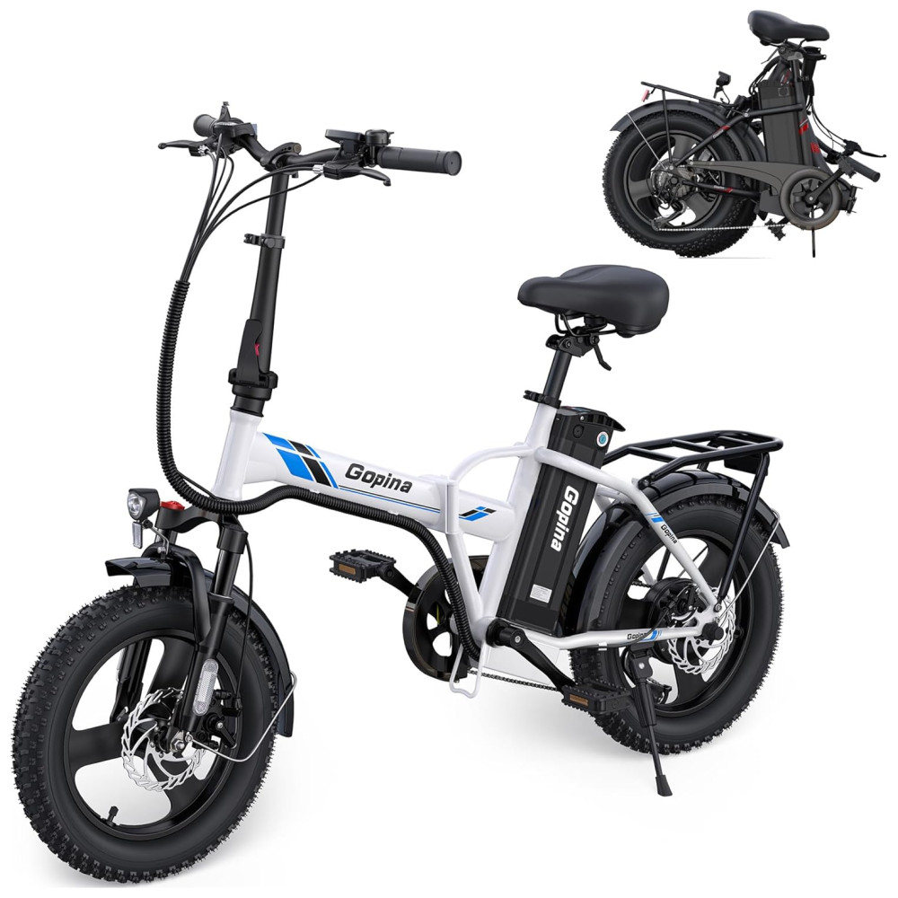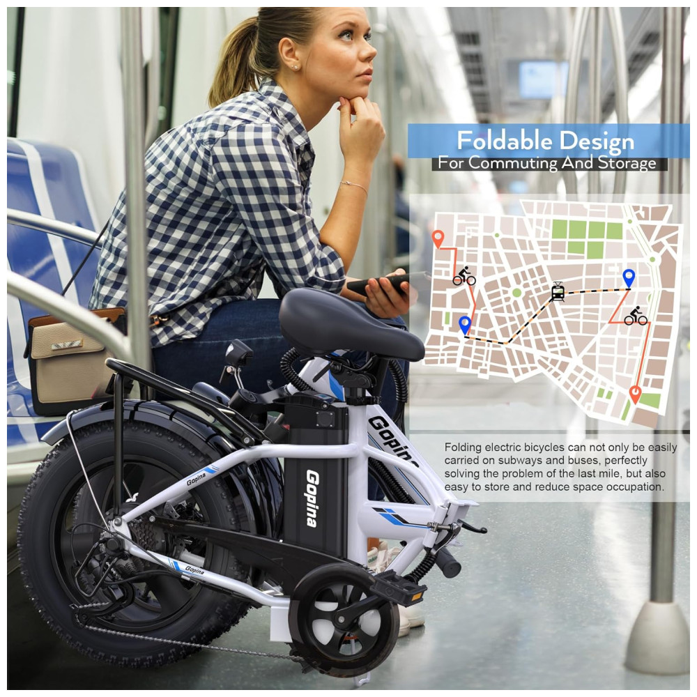 Bicicleta elétrica Vivi Gopina 16″ x 3.0 pneu largo potência máxima de 500W bateria removível de 48V autonomia de até 64km tela LCD 32km/h 7 velocidades certificação UL 2849 Branca e Azul