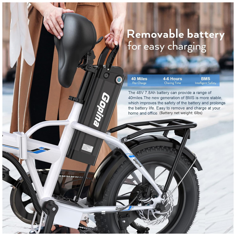 Descubra a Vivi Gopina: e-bike com motor 500W pico, bateria 48V 7,8Ah, pneus fat resistentes, quadro dobrável e autonomia de até 80 km. Perfeita para todo-terreno e deslocamentos urbanos.