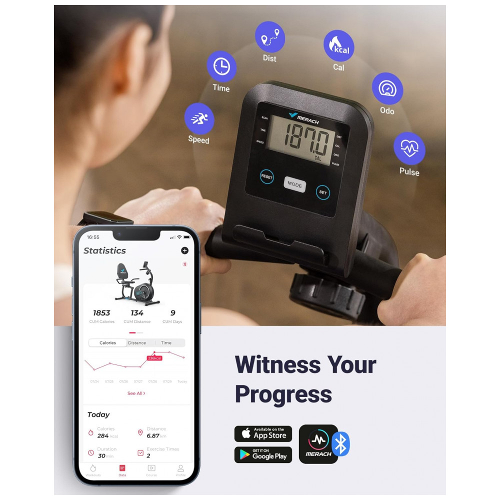 Monitor LCD Você pode medir e verificar convenientemente seus dados de treino, distância, tempo, calorias queimadas, frequência cardíaca e outras informações com o MERACH APP e o visor LCD. Vale a pena gravar suas realizações