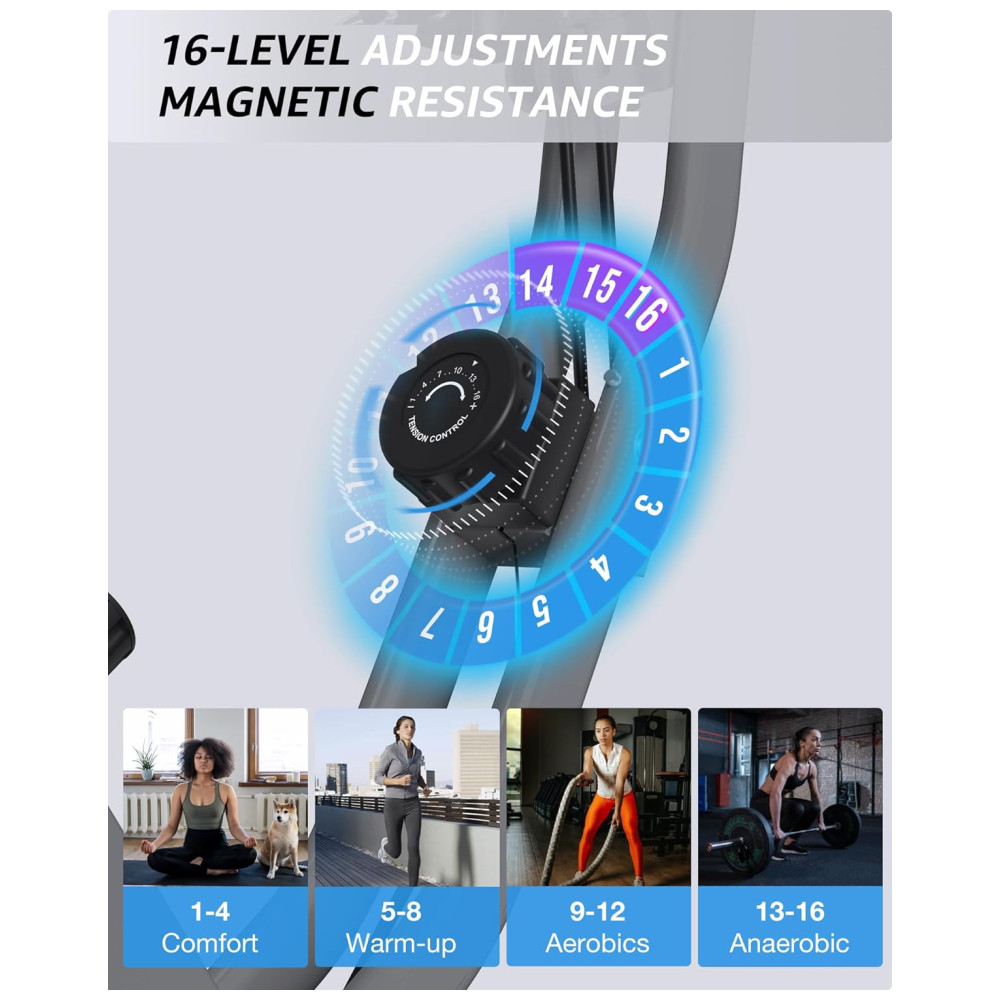 Resistência Magnética de 16 Níveis para Controle Máximo do Treino: Eleve seu treino ao próximo nível com o sistema de resistência magnética de 16 níveis da nossa bicicleta! Equipado com quatro ímãs de alta qualidade e volante de 3 kg com aro de alumínio, essa bicicleta ergométrica oferece ajustes de resistência suaves e silenciosos. Seja iniciante ou atleta experiente, você facilmente encontrará o desafio ideal para superar seus limites.