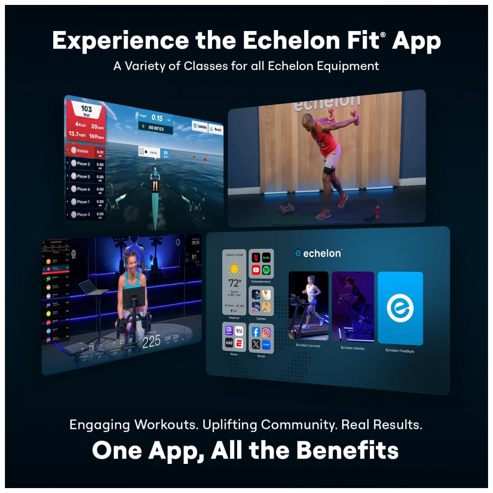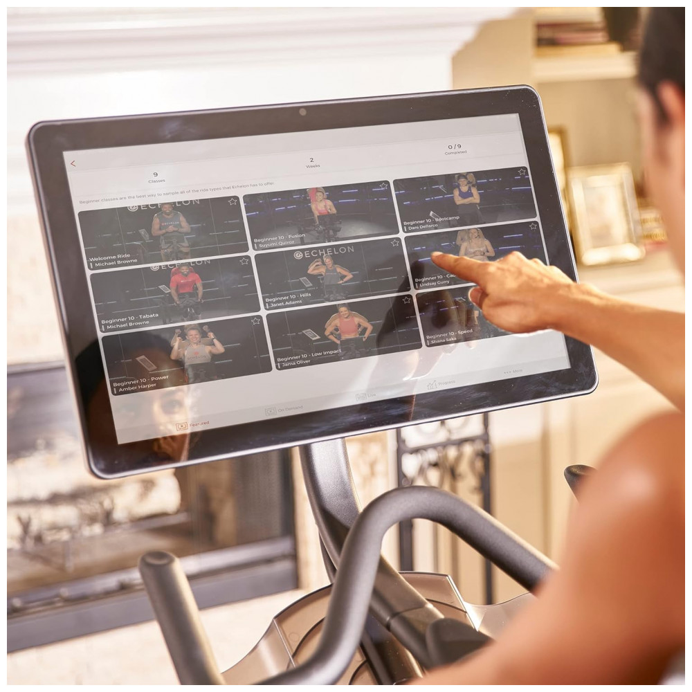 O Echelon EX 5s oferece experiências de fitness imersivas e com qualidade de estúdio a partir de uma tela sensível ao toque HD. Compita no placar e alcance suas metas de condicionamento físico com acesso 24 horas por dia, 7 dias por semana, a aulas ao vivo e sob demanda ministradas por instrutores de classe mundial. Echelon, criando um padrão mais alto em fitness conectado