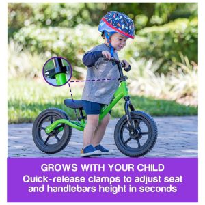 AJUSTES SEM FERRAMENTAS O assento e o guidão podem ser facilmente ajustados em segundos graças ao grampo de liberação rápida. Isso é superimportante, considere que você ajustará a altura durante todo o processo de aprendizado e à medida que seu filho crescer.