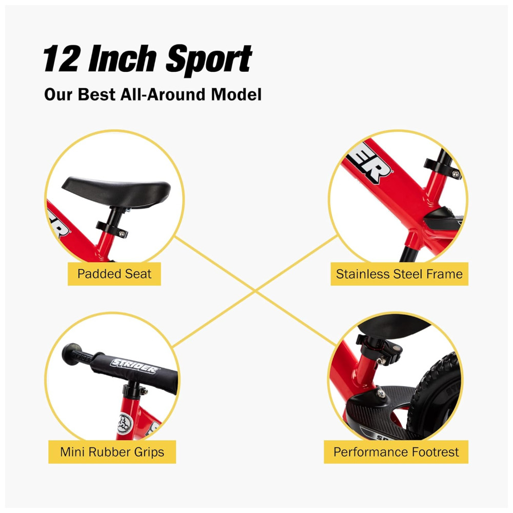 BICICLETA SPORT DE 30 centimetros A Sport é o nosso melhor modelo versátil. Possui mini grips de borracha, um assento acolchoado, uma almofada de segurança, o apoio para os pés de desempenho e uma altura inicial do assento de 27 centimetros para que seu filho possa montar facilmente na bicicleta desde tenra idade.