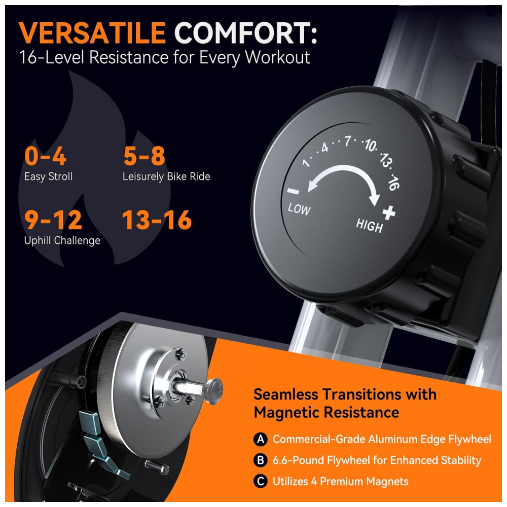 A resistência magnética de nível 16 para o melhor controle de treino, leve seu treino para o próximo nível com o sistema de resistência magnética de bicicletas 16 lados! Equipado com quatro ímãs de alto grau e um volante de alumínio de 2,99 quilos, esta bicicleta interna fornece ajustes de resistência sem costura e sussurros