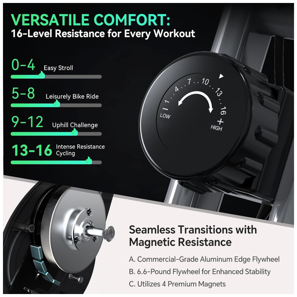 A resistência magnética de nível 16 para o melhor controle de treino, leve seu treino para o próximo nível com o sistema de resistência magnética de bicicletas 16 lados! Equipado com quatro ímãs de alto grau e um volante de alumínio de 2,99 quilos, esta bicicleta interna fornece ajustes de resistência sem costura e sussurros