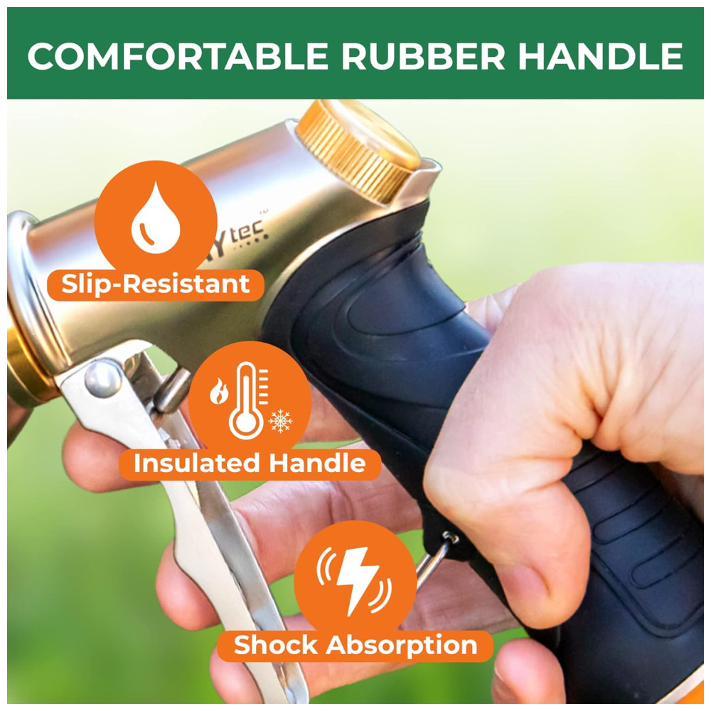 DESIGNADO PARA CONFORTO Uma alça revestida de borracha macia torna este bico de irrigação fácil e confortável de segurar. O gatilho frontal do punho da pistola é fácil de apertar e pode ser travado no lugar com a fivela incluída para pulverização contínua. As ações suaves sem esforço ao alternar entre os padrões irão surpreendê lo. Todos esses elementos críticos de design garantem que sua mão não se canse após longos períodos de uso.