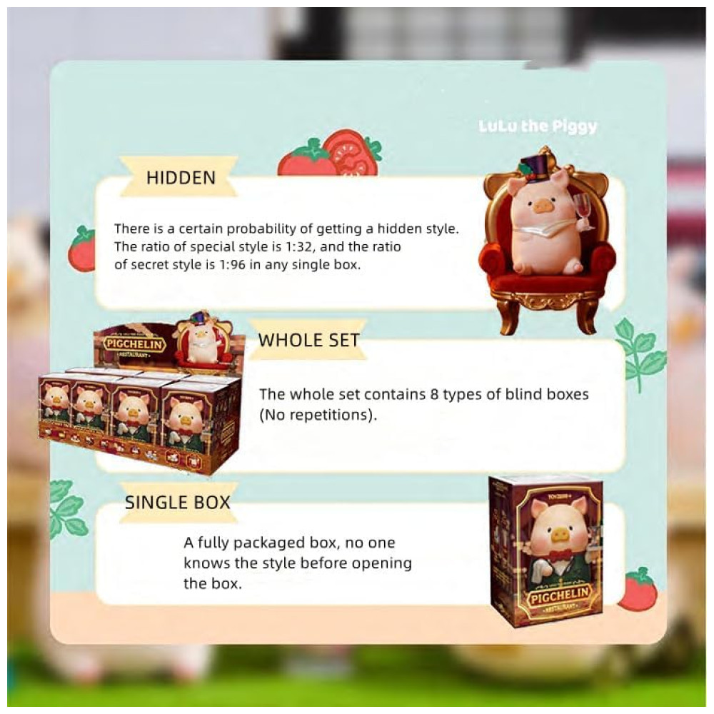 A Coleção Lulu The Piggy Pigchelin Restaurant apresenta 8 figuras regulares, 1 edição especial e 1 edição secreta. Desfrute do emocionante momento de desembrulhar! Torcemos para que você consiga sua favorita. Esta série conta com 8 designs regulares, 1 edição secreta e 1 super edição secreta. Cada caixa é disposta aleatoriamente, podendo conter a edição especial com probabilidade de 1 em 132 e a edição secreta com probabilidade de 1 em 196. Cada figura kawaii possui altura entre 5 e 11 centímetros, sendo pintadas à mão com detalhes encantadores. Perfeitas para presentear a partir dos 15 anos, decorar ambientes e expressar sentimentos. Feitas de material seguro, PVC não tóxico, inodoro e com cores vivas. Qualidade e detalhes impressionantes.