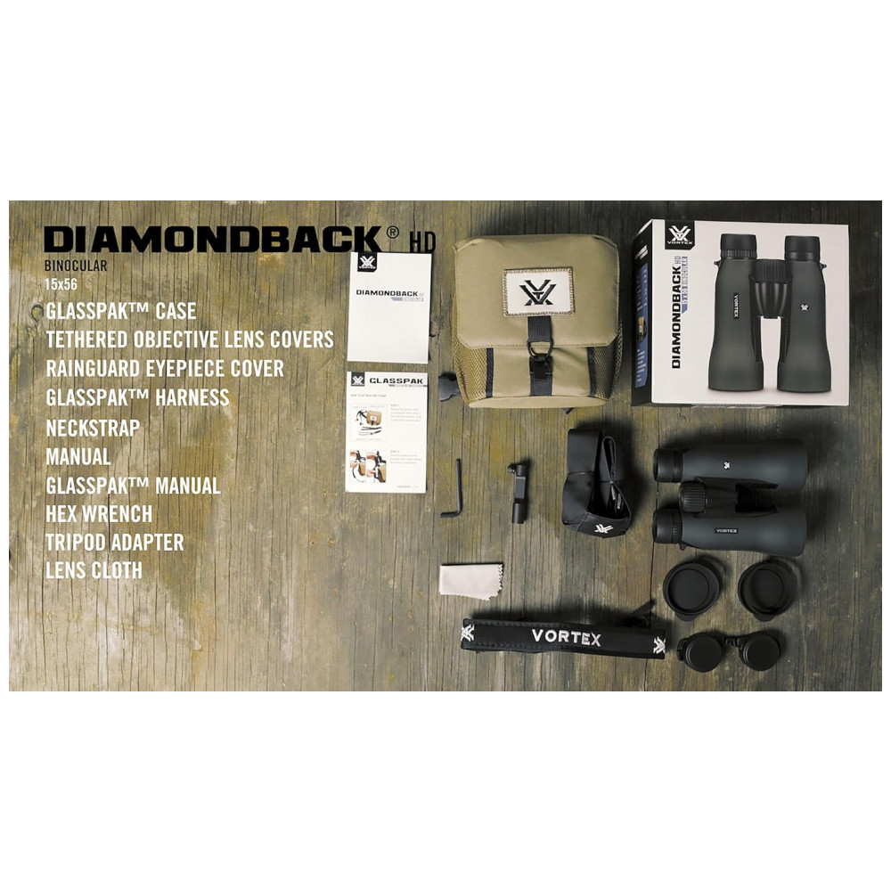 Ampliação de 15x e lentes objetivas de 56mm, esses binos Diamondback HD dão aos caçadores ocidentais o poder de que precisam para grandes caças em grandes países. Recomendado para ser com um tripé para evitar aperto de mão um adaptador de tripé está incluído com este modelo.