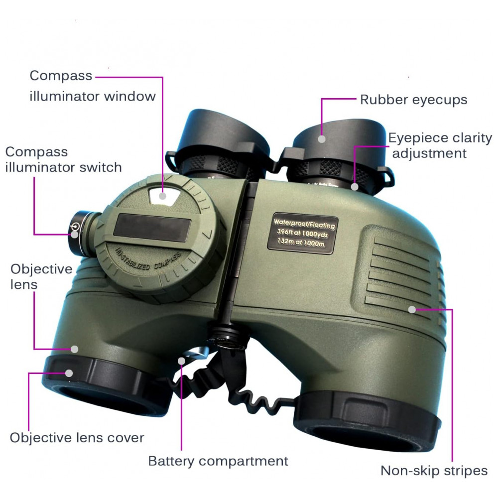 PERFEITO PARA MARINHO Binóculos marítimos com ampliação de 7x e lente objetiva de alívio ocular de , pupila de saída de 6, e campo de visão de ate 1000m.