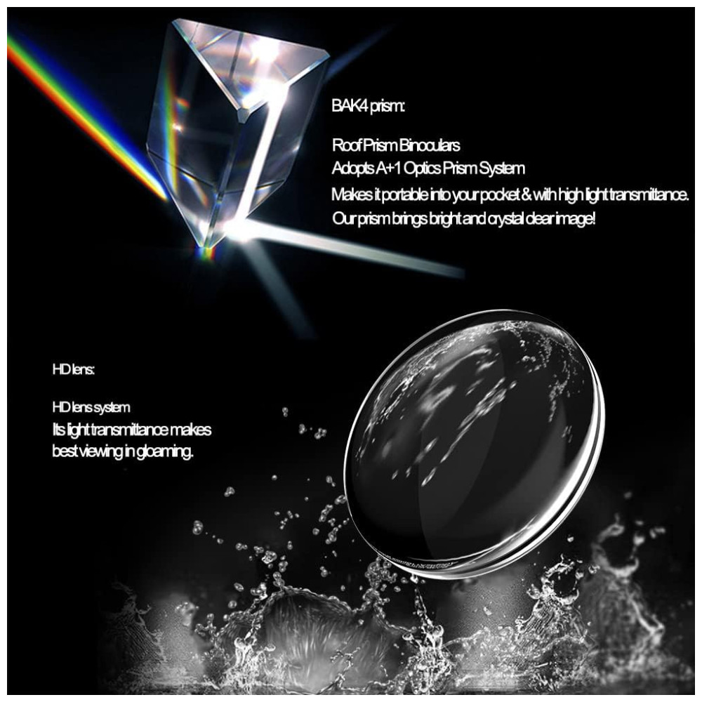 Óptica de alta qualidade e visão noturna clara Este binóculo usa a lente BAK4 FMC, sua lente asférica de filme FMC totalmente multi revestida fornece transmissão de luz, contraste e qualidade superiores. Pode ser à noite, mas não na escuridão total. Adequado para concertos, ópera, passeios turísticos e visualização astronômica.