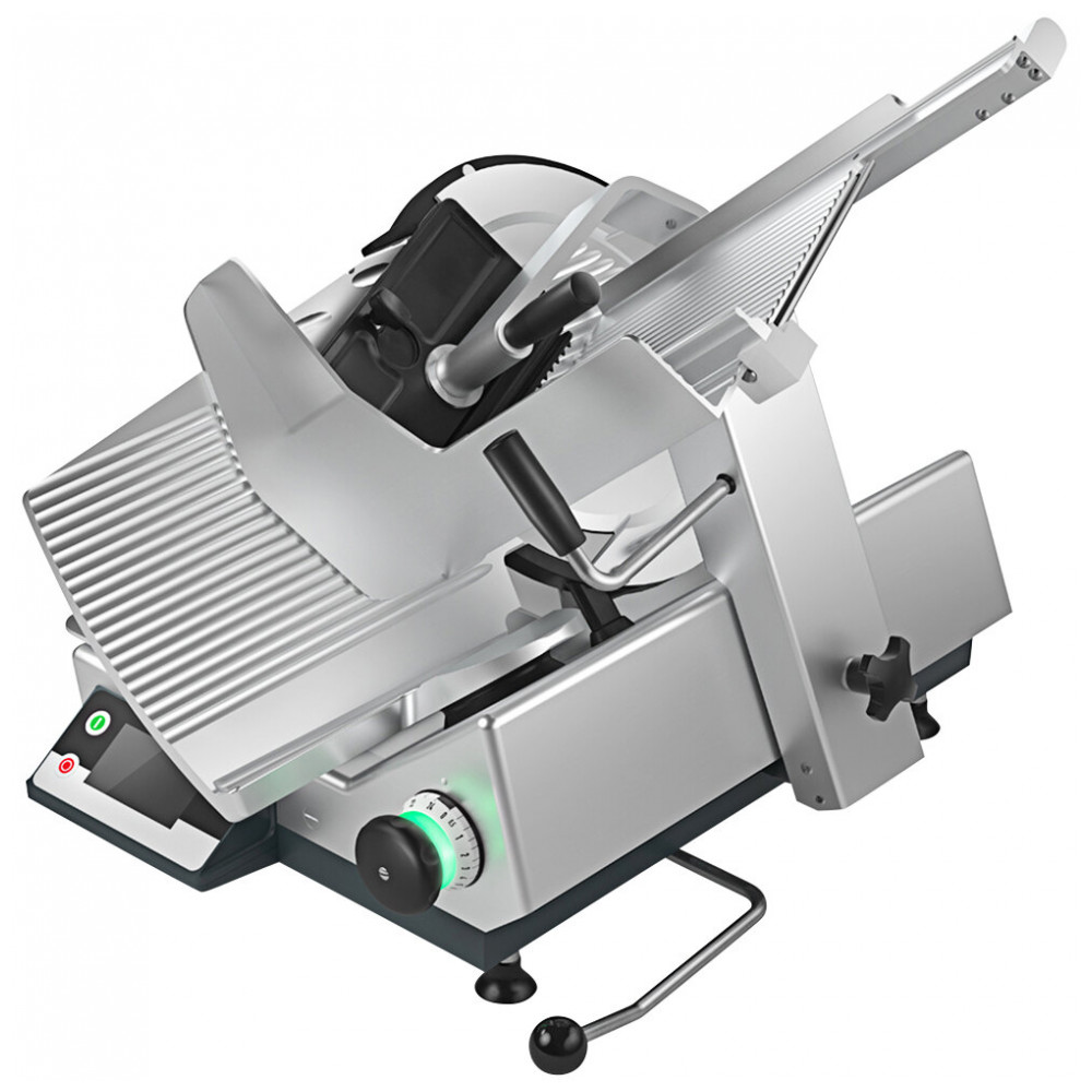 Este modelo oferece um sistema de intertravamento que bloqueia o carrinho e a placa de medição durante a limpeza para evitar acidentes. Além disso, o fatiador possui um indicador iluminado de segurança que mostra status verde quando a placa está fechada e o motor desligado, e vermelho quando a placa está aberta e a unidade pronta para uso.