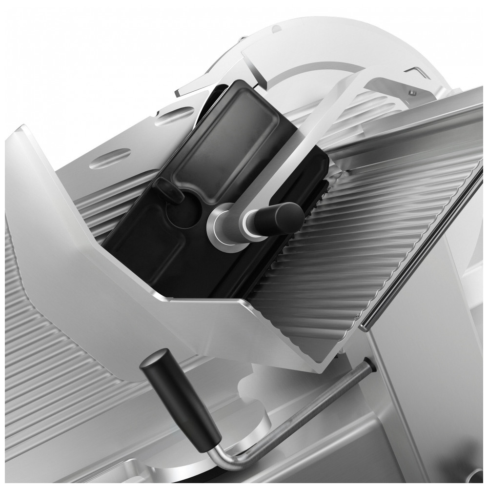 A fatiadora Bizerba GSP HD STD90GVRB é ideal para cortes pesados, combinando potência, precisão e segurança para uso comercial. Seu disco de corte de 33 cm revestido com uma liga dura de cromo possui dureza Rockwell 6062, garantindo uma lâmina afiada, fina e resistente que mantém o fio mesmo ao cortar carnes delicadas, queijos úmidos ou blocos duros. O motor potente de 1/2 CV gira a lâmina a 319 rotações por minuto para fatiar rapidamente carnes, queijos, frutas e vegetais com eficiência. O carrinho de alimentação automático e discreto facilita operações robustas, enquanto o protetor de polegar de 8,9 cm de largura oferece segurança aprimorada ao operador. O seletor ajustável permite definir a espessura da fatia entre 0 a 1,5 cm, atendendo a diversas necessidades. Seu design semiautomático reduz a fadiga do usuário, com ranhuras precisas no carrinho inclinadas a 25 graus para facilitar o deslizamento dos alimentos na direção do operador. Para manter a área limpa, a fatiadora conta com um defletor de resíduos e um sistema de drenagem eficiente, além de uma construção monobloco que evita o acúmulo de partículas de alimentos. Fabricada com corpo anodizado de alumínio selado e superfícies de contato fáceis de limpar, ela assegura higiene máxima e atende a rigorosos padrões de segurança alimentar. O suporte para restos com 306 pontos mantém os alimentos estáveis para cortes suaves e seguros. Além disso, a fatiadora possui um braço lateral robusto para facilitar sua elevação, limpeza e higienização. Sua lâmina vem acompanhada de afiador remoto próprio para lava-louças, garantindo afiação consistente, além de suporte para afiador e uma capa protetora resistente. Para proteção adicional, o equipamento possui desligamento automático da lâmina programável em 15, 30 ou 45 segundos e um sistema de bloqueio que trava o carrinho e o medidor, ativando um mecanismo de segurança que impede acidentes durante a limpeza. Ideal para uso em balcões ou cozinhas industriais, ela opera com conexão elétrica de 110V e 60Hz, em fase única. Com design sofisticado e materiais de alta qualidade, a fatiadora Bizerba oferece durabilidade mesmo em operação contínua, sendo uma escolha superior para ambientes profissionais que exigem performance e segurança.