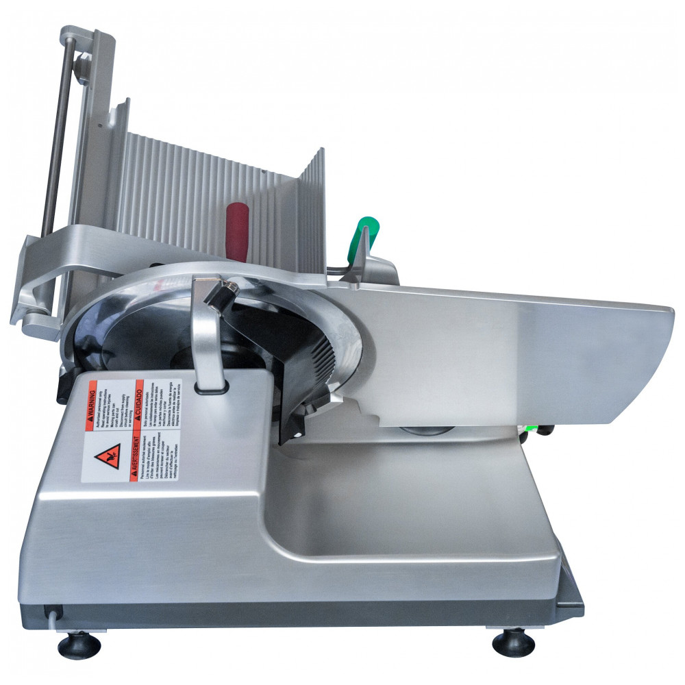 O fatiador Bizerba GSP HD I 90GCB 13 é a solução definitiva para quem busca desempenho, segurança e eficiência na preparação de carnes, queijos, frutas e legumes frescos. Equipado com uma afiada lâmina de 13 polegadas (33 cm) revestida com liga dura de cromo, possui dureza Rockwell 6062, garantindo cortes precisos, rápidos e duradouros mesmo em produtos delicados ou blocos úmidos e duros. Seu motor potente de 1/2 CV proporciona uma velocidade da lâmina de 319 rotações por minuto, garantindo máxima produtividade para restaurantes em crescimento ou estabelecimentos consolidados. A operação semiautomática com alimentação por gravidade de baixa altura facilita a movimentação dos alimentos, reduzindo o esforço do operador, que conta com um resistente protetor de polegar de 8,9 cm para maior segurança. O seletor ajustável permite fatiar alimentos com espessura entre 0 e 1,5 cm, atendendo a todas as necessidades em sua cozinha. A estrutura anodizada em alumínio alia durabilidade e design moderno, além de garantir alto padrão de higiene com superfícies fáceis de limpar e sistema de drenagem que remove resíduos e líquidos dos alimentos. O design inclui ainda um braço lateral que facilita a elevação do conjunto para limpeza completa e sanitização. Para proteção adicional, o aparelho conta com desligamento automático da lâmina programável (15, 30 ou 45 segundos), indicador luminoso de segurança que sinaliza quando a máquina está pronta para uso ou limpeza e um sistema de bloqueio que previne acidentes durante a manutenção. Acompanha afiador remoto lavável em lava-louças com suporte, além de capa protetora reforçada para a lâmina. Com base em um projeto robusto e materiais de alta qualidade, esse fatiador é um equipamento confiável, seguro e versátil, ideal para ambientes comerciais exigentes que buscam excelência e rapidez no preparo dos alimentos. Requer alimentação elétrica de 120 Volts e frequência de 60 Hz. Aproveite a qualidade Bizerba para sua cozinha profissional!