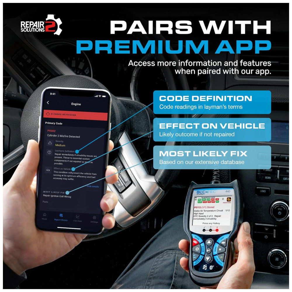 O scanner OBD2 Bluetooth BLCKTEC 440 é uma ferramenta profissional para diagnóstico automotivo, compatível com veículos desde 1996 que seguem o padrão OBD2, incluindo carros, SUVs, caminhonetes leves e veículos a diesel 12V. Equipado com tela colorida de 2,8 polegadas, fornece gráficos de dados em tempo real para monitoramento preciso do desempenho do motor, sistema de carregamento da bateria e emissões. A ferramenta permite leitura e limpeza rápida de códigos de falhas, testes do sistema de bateria, e inclui indicações visuais claras para prontidão emissões (I/M readiness). Compatível com iOS e Android, opera através da conexão Bluetooth sem necessidade de baterias, alimentando-se diretamente da porta de diagnóstico do veículo (16 pinos). Indicada para uso profissional e doméstico, oferece atualizações gratuitas vitalícias e suporte técnico especializado.