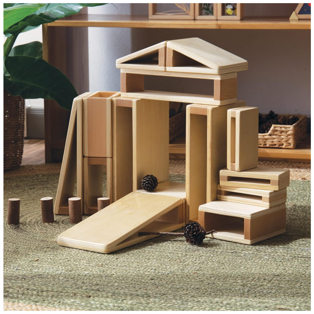 Blocos de construção ocos em madeira Guidecraft Mini Hollow Blocks com 16 peças para atividades de construção em grande movimento