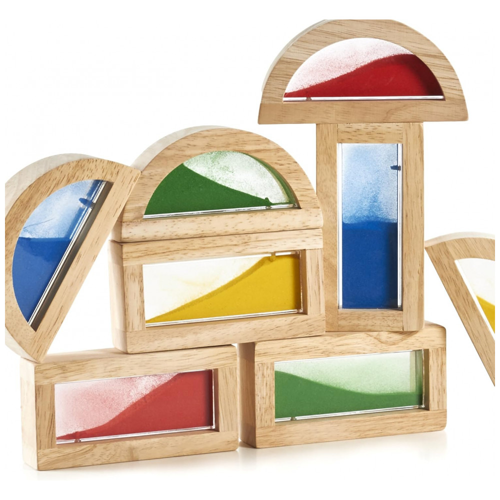 Os Blocos Rainbow Sand da Guidecraft são compostos por estruturas em madeira de borracha dura com janelas insetadas de acrílico transparente preenchidas com areia colorida, formando um conjunto de 8 peças para empilhamento. O kit inclui 4 blocos retangulares e 4 blocos em formato meia-lua, compatíveis com medidas padrão de blocos unitários, ideais para atividades de construção e exploração visual. Fabricados com molduras robustas em madeira maciça e plexi colorido, suportam uso intensivo a partir de 24 meses até 84 meses, com dimensões compactas de 21,6 cm x 21,6 cm x 7,6 cm. Este modelo G3014 promove coordenação motora fina e reconhecimento de formas por meio de empilhamento estável e transparência dos materiais. A embalagem padrão garante proteção durante o transporte.