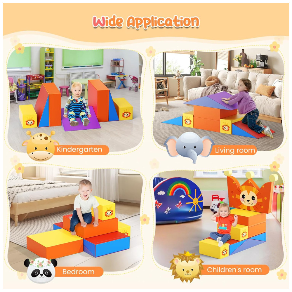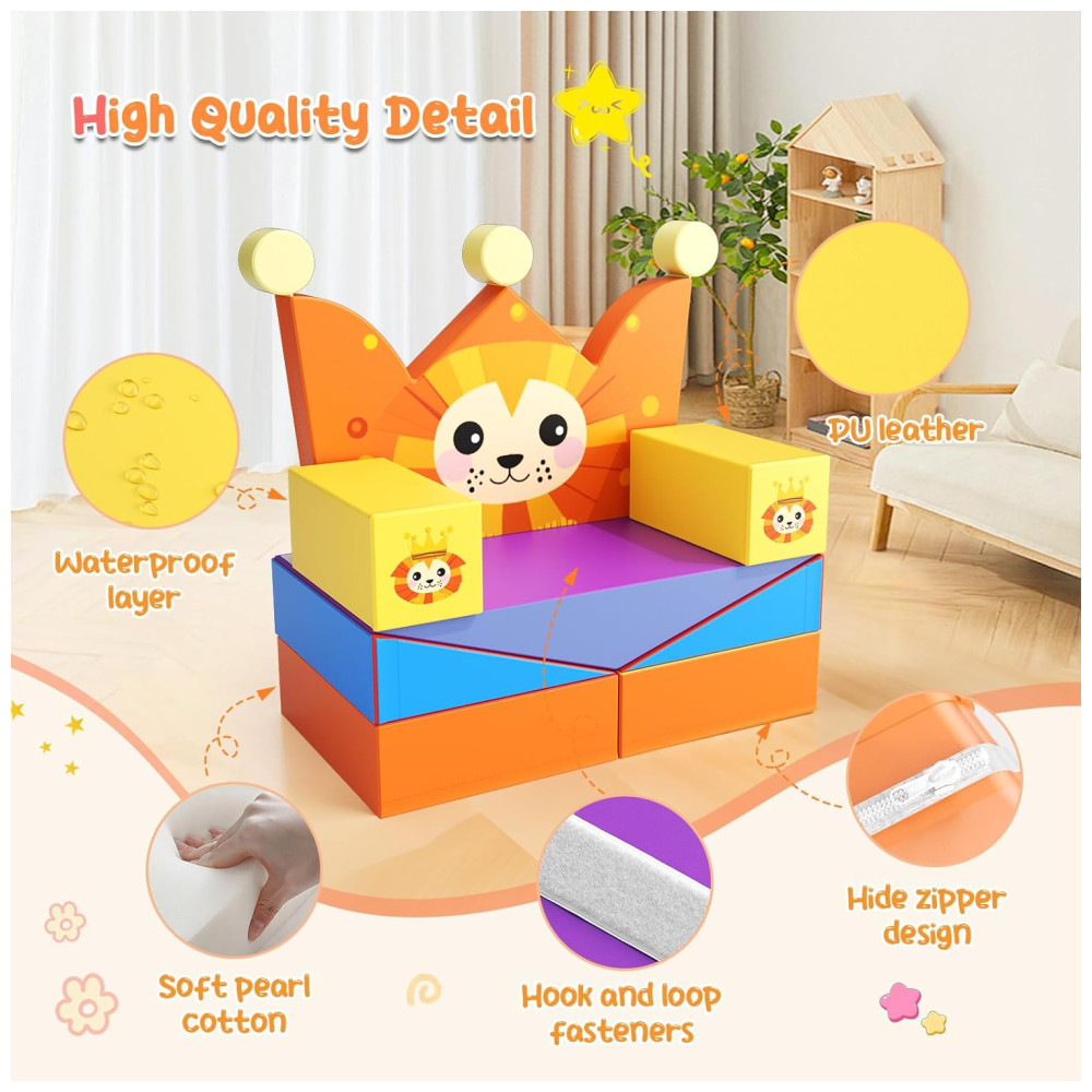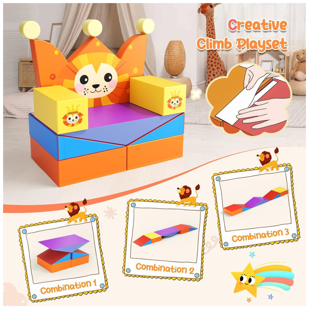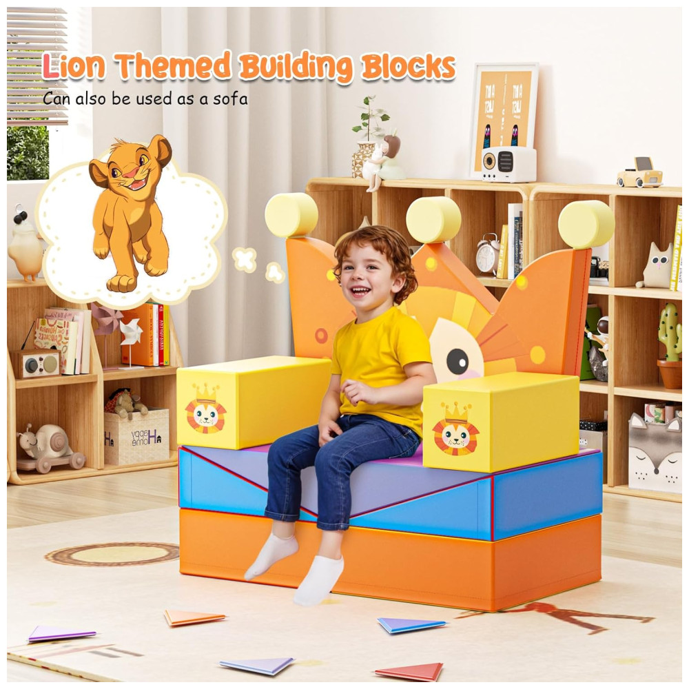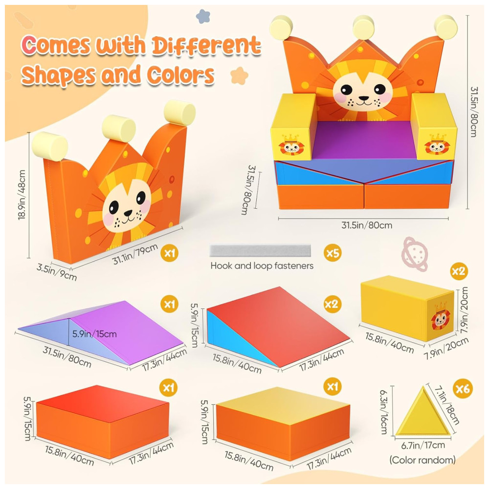 “Conjunto de Soft Play Nova Atualização” – O conjunto de atividades Lischwert para escalar e rastejar com tema de leão inclui 8 blocos de espuma para escalar, 1 encosto com design de coroa de leão, 2 corrimãos, 1 bloco para balanço e 4 almofadas de bloco. Eles podem ser empilhados e reorganizados em diferentes formas, estimulando a imaginação da criança enquanto se divertem.