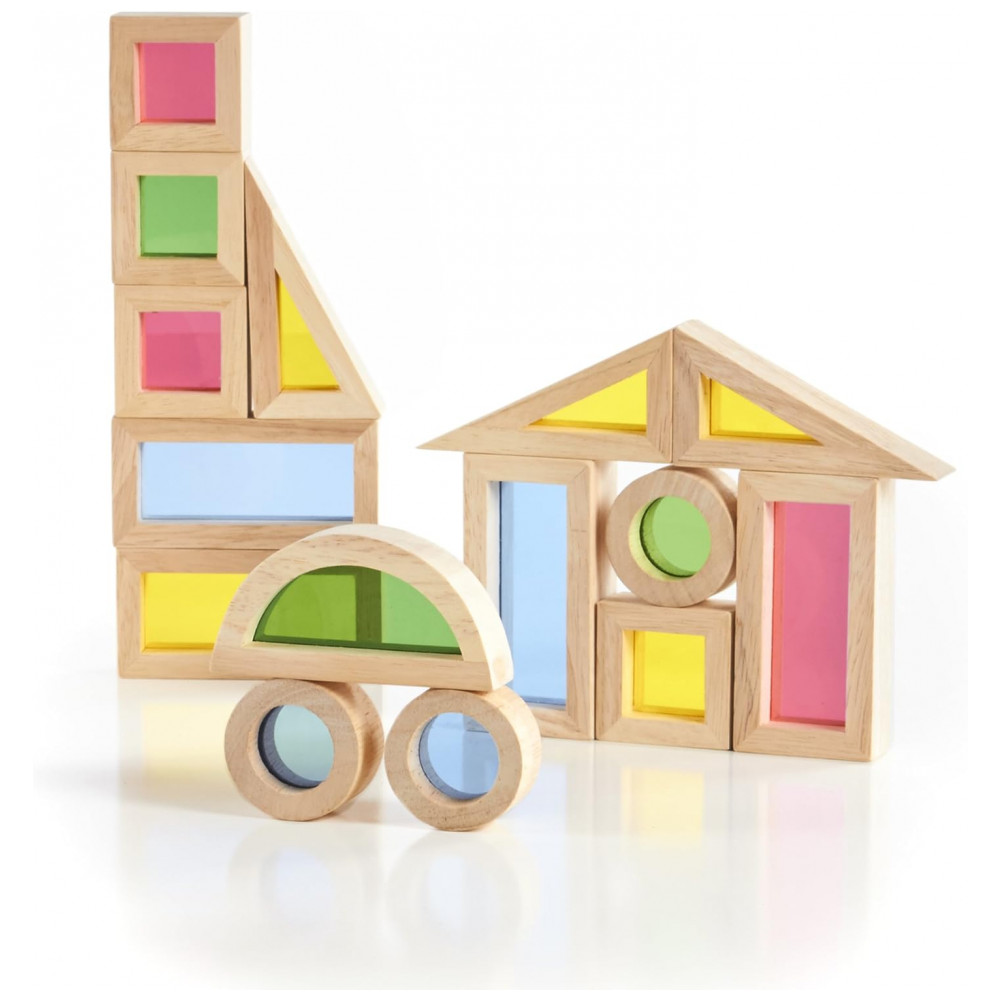 Conteúdo da embalagem: 20 blocos Jr. Rainbow Blocks em formatos variados com janelas acrílicas coloridas