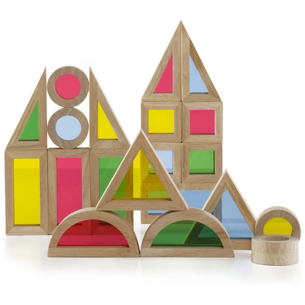 Conteúdo da embalagem: 40 blocos Jr. Rainbow Blocks em diferentes formatos com janelas acrílicas coloridas