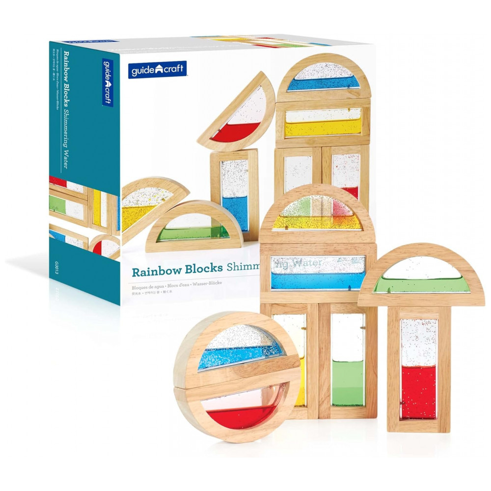Blocos sensoriais Rainbow Blocks Shimmering Water Guidecraft em madeira com janelas de água colorida – 8 peças