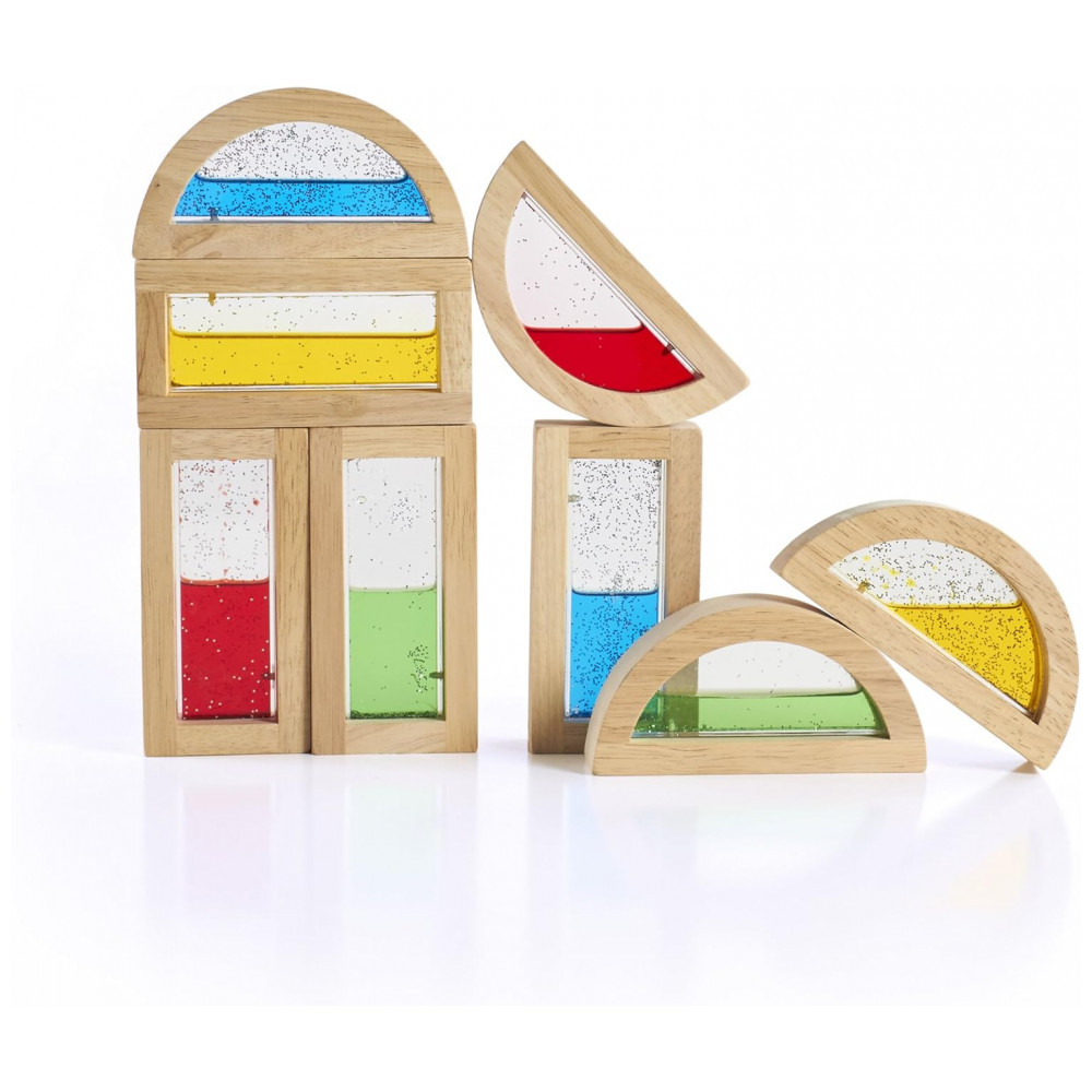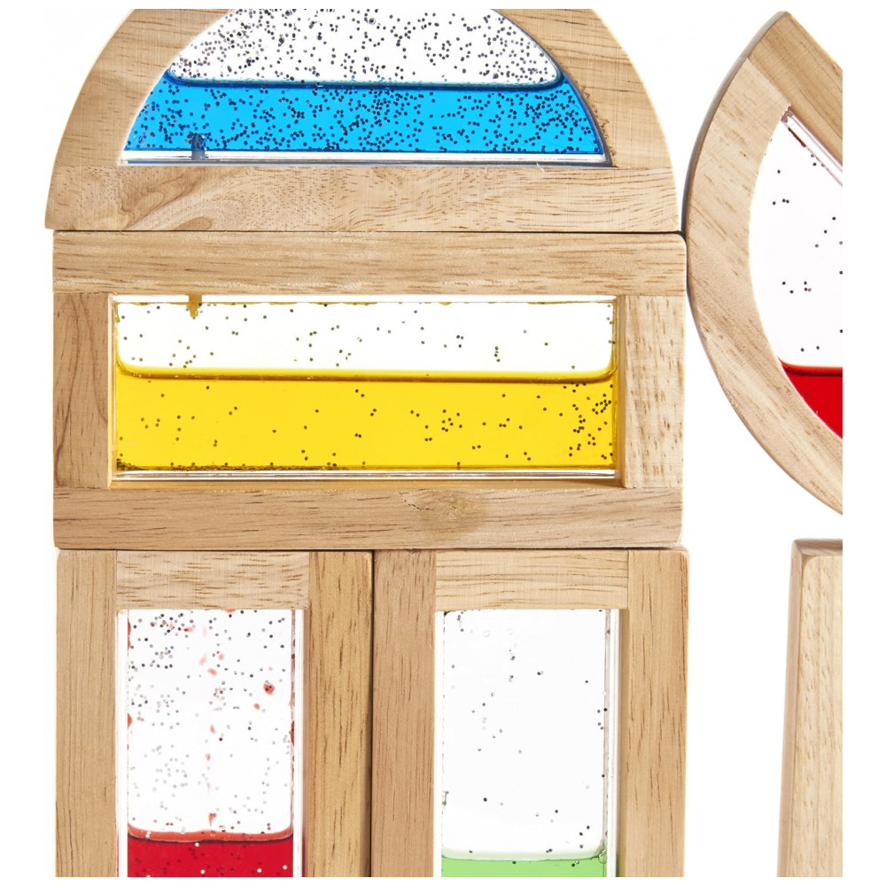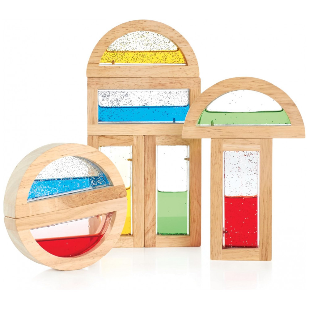 O set inclui 8 blocos no total, com 4 peças retangulares e 4 em formato de meia-lua, dimensionadas com base nas medidas padrão de unit blocks para facilitar a integração com outros blocos de construção em madeira. As molduras em madeira apresentam cantos arredondados e superfícies lixadas, enquanto as janelas de acrílico transparente contêm água colorida e partículas cintilantes, favorecendo coordenação olho-mão, percepção visual e exploração de cores em contextos educativos.
