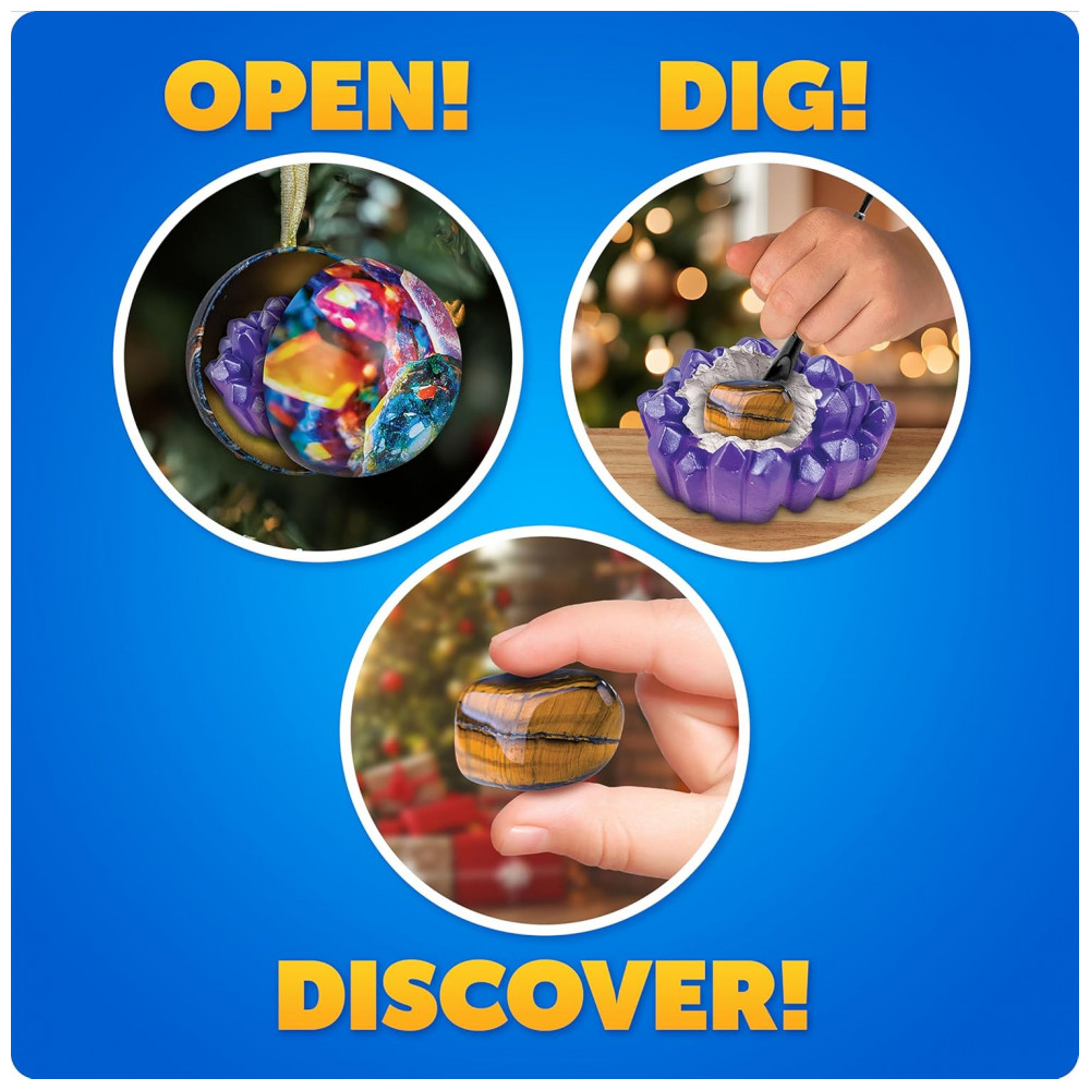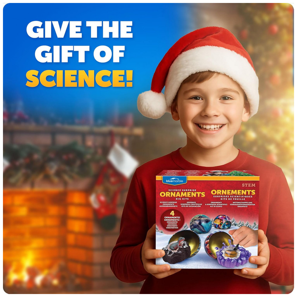 Blue Marble Science Surprise Christmas Ornament Kit para Crianças – 4 Ornamentos com Mini Kit de Escavação de Gemas e Dinossauros Brinquedos Educativos de Natal
