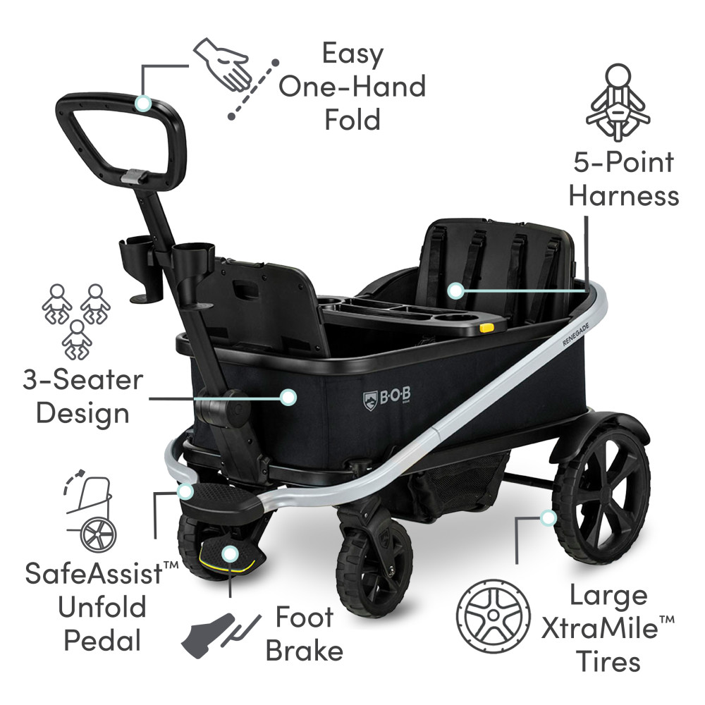 bSafeAssist Soft UnfoldbConfiguração fácil e segura significa que você está pronto para começar a qualquer momento brbOneHand FastFold Closeb Dobra se rapidamente com uma mão e três etapas simples brbDesign espaçoso de 3 lugares para três crianças e todos os seus itens essenciais brbPneus XtraMile grandesb Robusto e pronto para qualquer terrenobrbSuspensão suave Shoxb mantém os pilotos confortáveis estrada para trilha e em todos os lugares no meiobrbSteerSteady Push a Pull Handle bCruzeiro como você escolher Empurre como um carrinho de bebê puxe como um vagão brbChild Snack Tray amp 2 porta copos para adultos bMantenha suas bebidas favoritas ao alcance para o passeiobbrArnês de segurança ajustável de 5 pontos bconstruído em cada posição de assento brbOneStep Footbrakeb é rápido e fácil para usar brbSegurança que vai além bAtender aos requisitos da ASTM O Renegade Wagon passa por testes internos adicionais para desempenhob brQuadro de alumínio soldadob é construído de forma resistente sem sobrecarregar vocêbsp